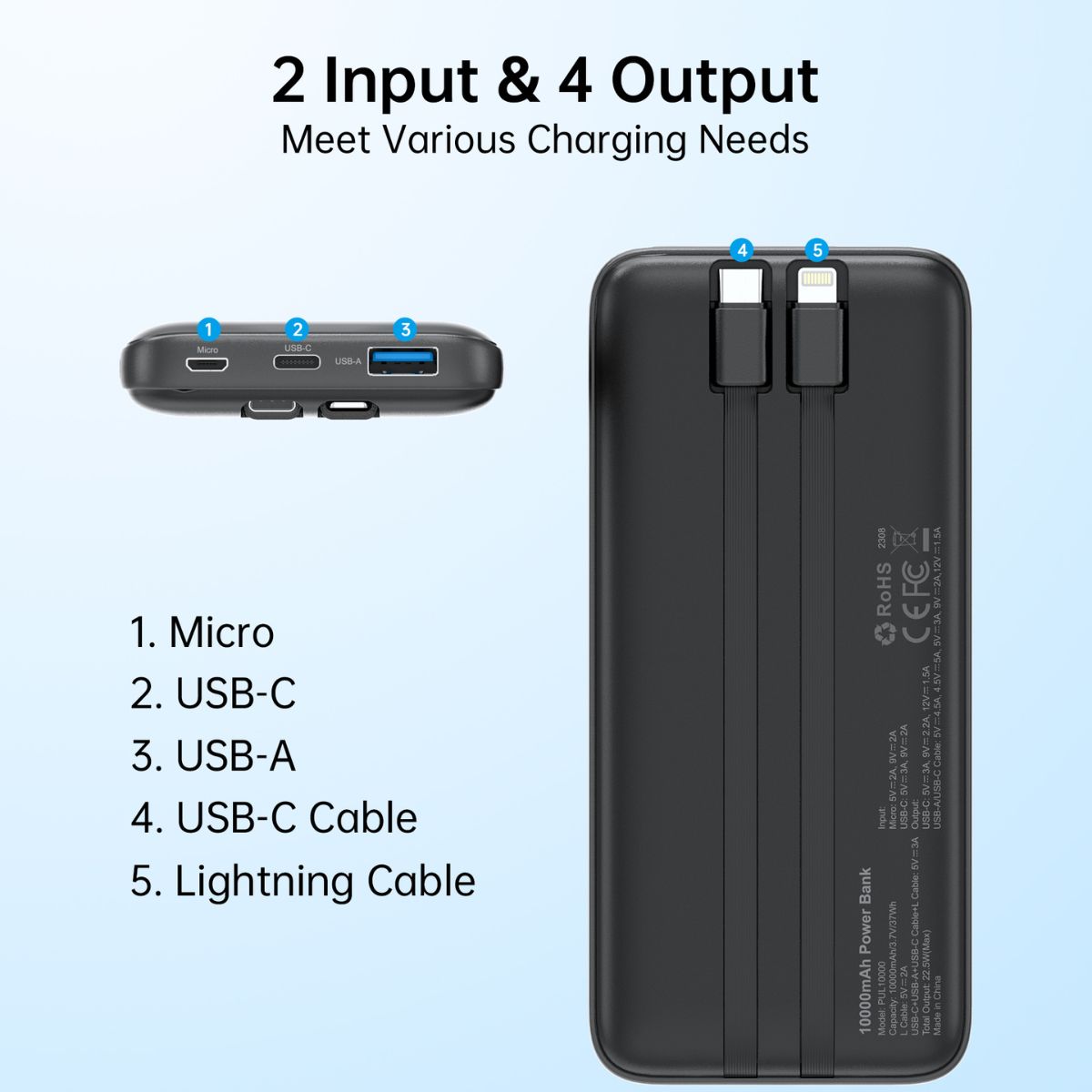 Pin dự phòng Choetech B654 dung lượng 10.000mAh 22.5W tích hợp 2 cáp sạc Type C và L ( Hàng chính hãng)