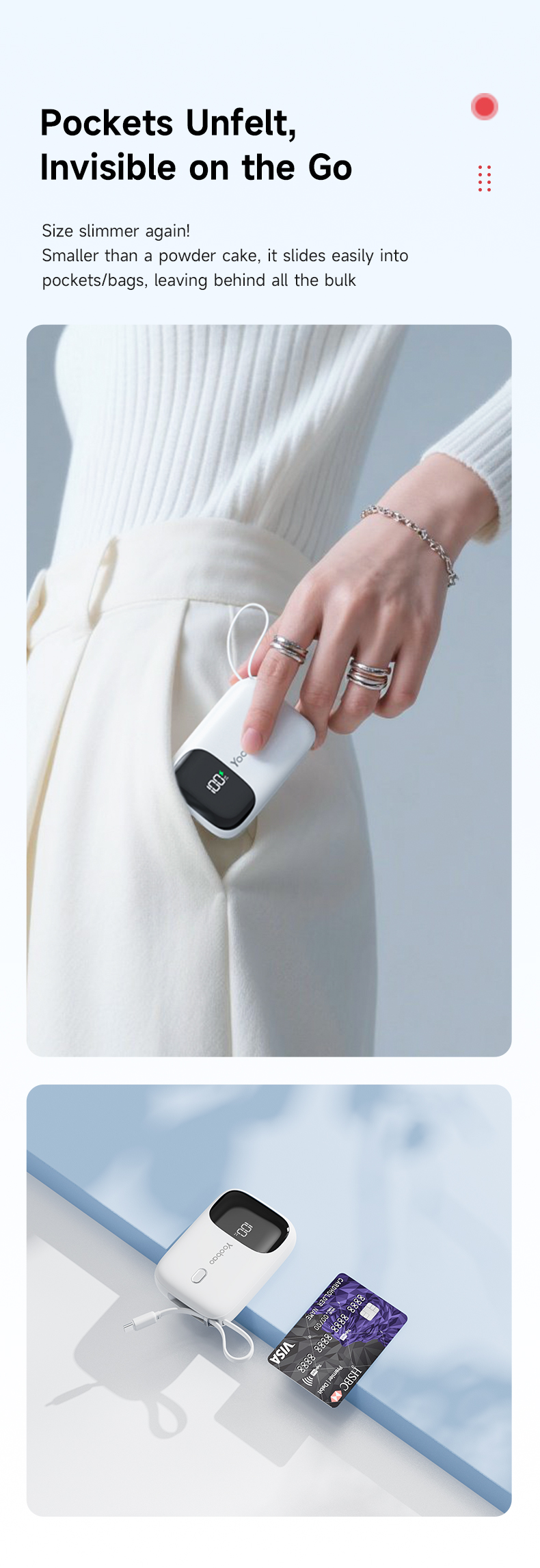 Pin sạc Yoobao Z5 có kích thước chỉ 87 x 60 x 26.8 mm và trọng lượng chỉ 182g, rất dễ dàng mang theo trong túi xách, balo hoặc túi quần. Thiết kế nhỏ gọn này giúp bạn không cảm thấy vướng víu khi di chuyển, mang lại sự tiện lợi tối đa khi sử dụng trong công việc, đi du lịch, hay trong các chuyến công tác.