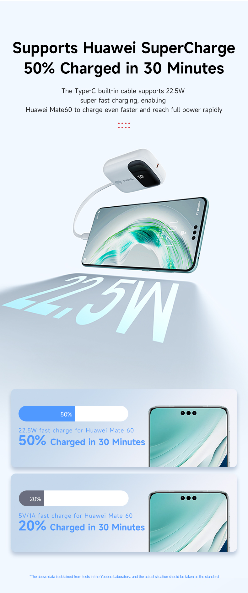 Với sạc nhanh 20W, Yoobao Z5 giúp bạn tiết kiệm thời gian đáng kể khi sạc các thiết bị. Đặc biệt, khi kết hợp với cổng sạc nhanh PD20W, bạn có thể sạc đầy 50% dung lượng chỉ trong 30 phút, giúp bạn tiết kiệm thời gian sử dụng tối đa.