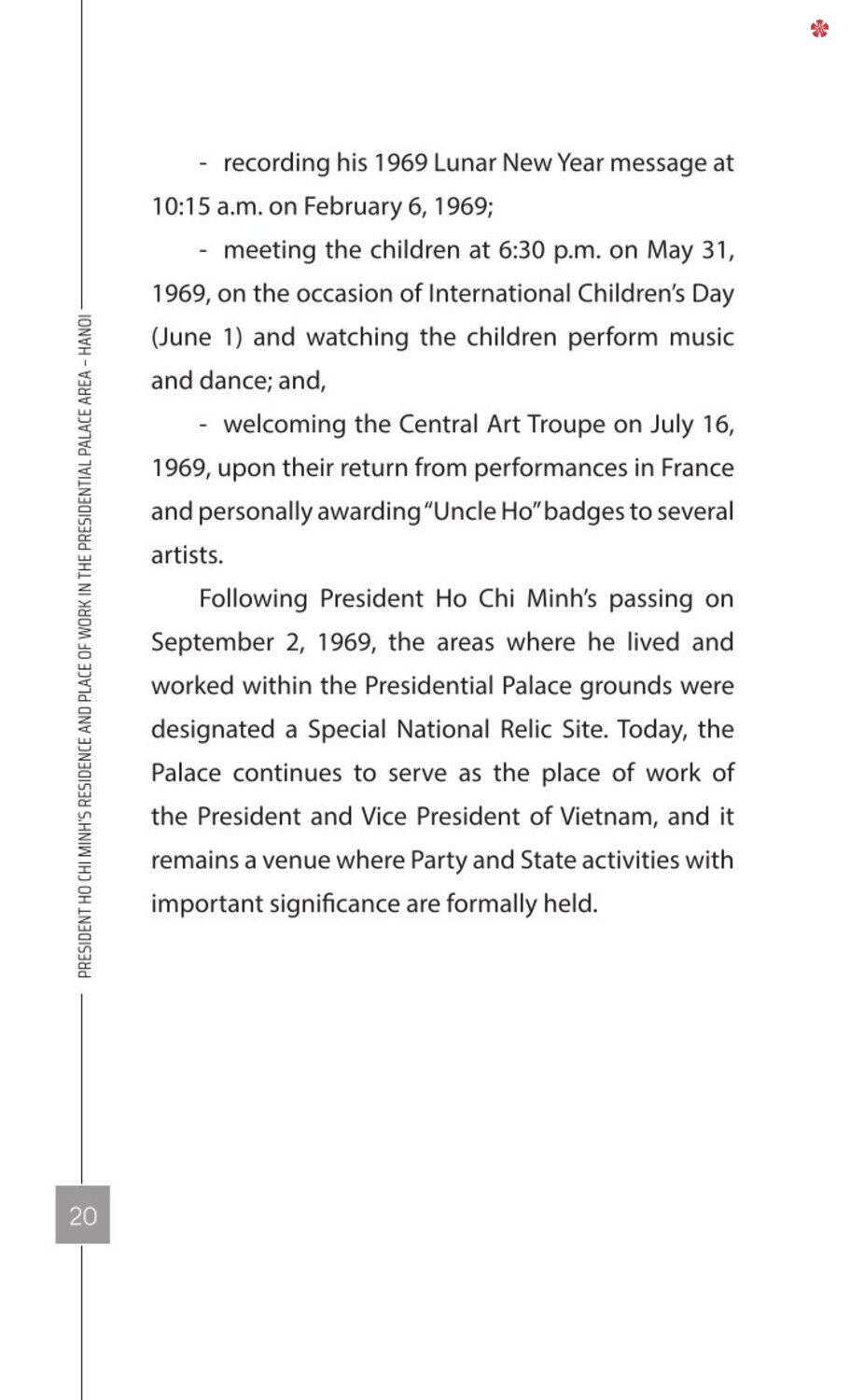 Mua tại TiktokThe book President Ho Chi Minh’s Residence and Place of Work in the Presidential Palace Area - Hanoi offers readers a valuable source of documents, helping each of us gain a deeper understanding of the life of the Vietnamese people’s beloved leader. The book vividly recreates and brings readers to every corner, every keepsake, and every simple yet profoundly meaningful story associated with President Ho Chi Minh in the Presidential Palace area—such as House 54, the Stilt House, House 67, the Fishpond, the Mango Path, and the Garden, among others.