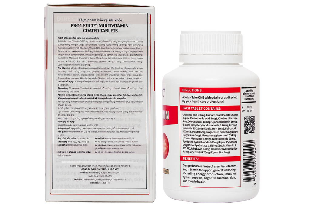 PROGETIC Multivitamin Coated Tablets là sản phẩm bổ sung vitamin và các khoáng chất thiết yếu cho người trưởng thành như vitamin A, C, B1, B2, B3, B6, B12, Kẽm, Sắt, Mới liều dùng 1