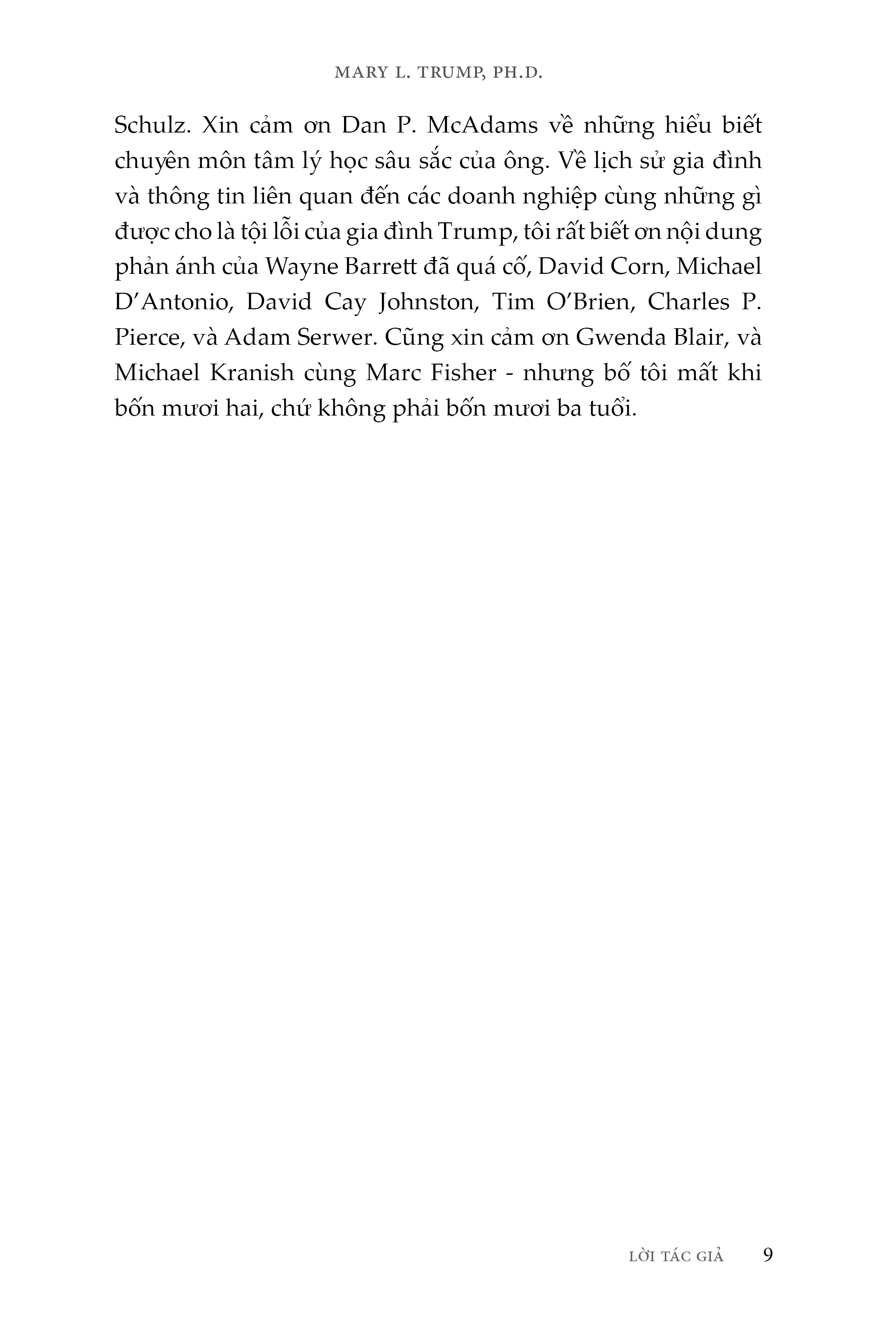 Đã có nhiều chuyên gia tâm lý, học giả và phóng viên tìm cách phân tích những thiếu xót chí mạng của Donald J. Trump. Nhưng Mary L. Trump lại có được nền tảng giáo dục, góc nhìn sâu sắc và sự thân thiết cần thiết để hé lộ những điều tạo nên con người của Tổng thống thứ 45 Hoa Kỳ - Donald Trump, cũng như các thành viên khác trong gia đình bà. Chỉ riêng bà là có thể kể lại câu chuyện hấp dẫn này, không chỉ bởi bà có cái nhìn của người trong cuộc, mà còn bởi bà là thành viên duy nhất trong nhà Trump sẵn lòng kể cho mọi người biết sự thật về một trong những gia đình quyền lực nhất thế giới nhưng cũng không kém phần rối loạn.