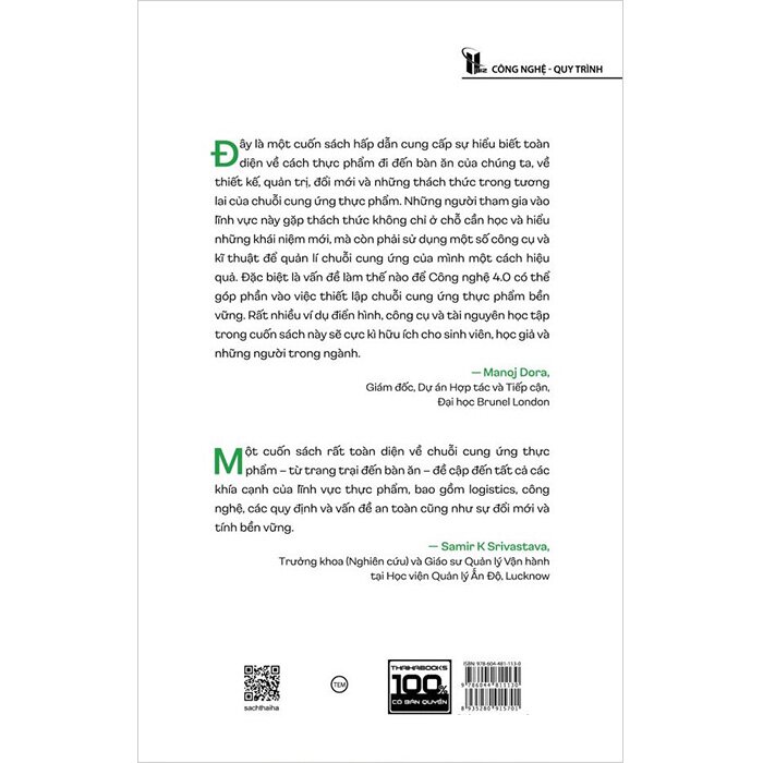 Đặc biệt là vấn đề làm thế nào để Công nghệ 4.0 có thể góp phần vào việc thiết lập chuỗi cung ứng thực phẩm bền vững. Rất nhiều ví dụ điển hình, công cụ và tài nguyên học tập trong cuốn sách này sẽ cực kì hữu ích cho sinh viên, học giả và những người trong ngành – Manoj Dora (Giám đốc dự án hợp tác và tiếp cận, Đại học Brunel London)