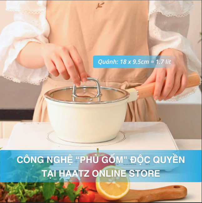 Quánh chống dính phủ gốm Haatz Hàn Quốc size 18cm vung kính đáy từ, Cán gỗ chắc chắn Zalo 0986588655