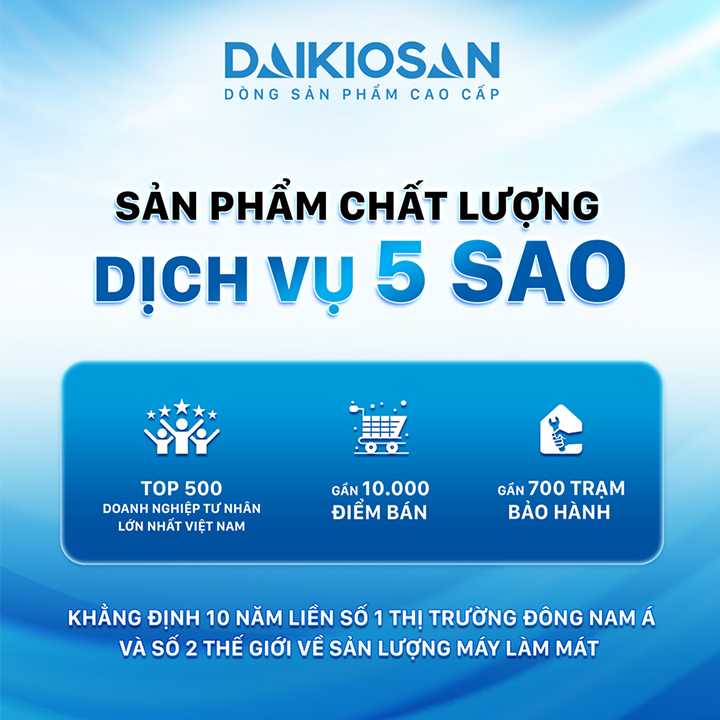 Với linh kiện cao cấp và độ bền bỉ, Quạt điều hòa không khí Daikiosan tự hào là thương hiệu đồng hành bên lâu trong suốt 10 năm liền tại thị trường Đông Nam Á, đứng thứ 2 toàn cầu về sản xuất máy làm mát (quạt điều hòa). Hơn 700 trạm bảo hành trải dài khắp cả nước, đội ngũ hỗ trợ chất lượng luôn sẵn sàng, đảm bảo trải nghiệm hàng đầu cho khách hàng. Để biết thêm thông tin về sản phẩm và chương trình khuyến mãi tốt nhất, hãy liên hệ 0962 483 483.