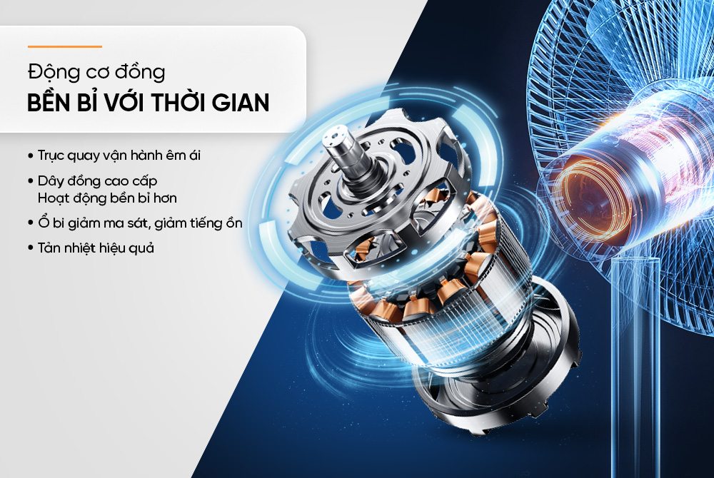 Động cơ đồng là yếu tố quan trọng giúp Quạt đứng Sunhouse 5 cánh SHD7352 vận hành hiệu quả và bền bỉ hơn. Ưu điểm của động cơ đồng là hiệu suất hoạt động cao, tạo ra lực mạnh hơn, giúp lưu lượng gió được tăng cường và phân phối một cách đồng đều. Hiệu suất chuyển đổi năng lượng tốt cũng giúp tiết kiệm điện năng, và hơn hết, việc tản nhiệt hiệu quả của động cơ cũng giúp kéo dài tuổi thọ của sản phẩm.