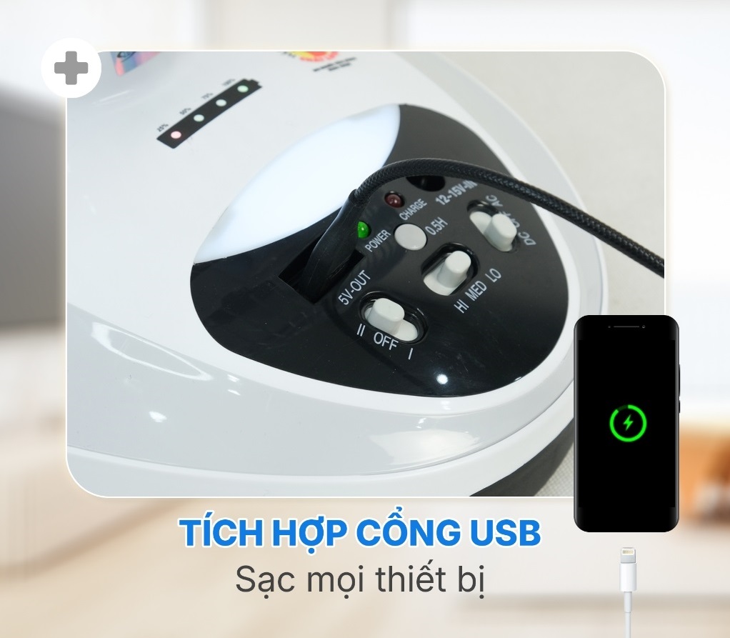 Bảng điều khiển của sản phẩm được thiết kế với các nút công tắc và đèn báo, giúp người dùng dễ dàng điều khiển và kiểm tra trạng thái và mức độ pin của sản phẩm.