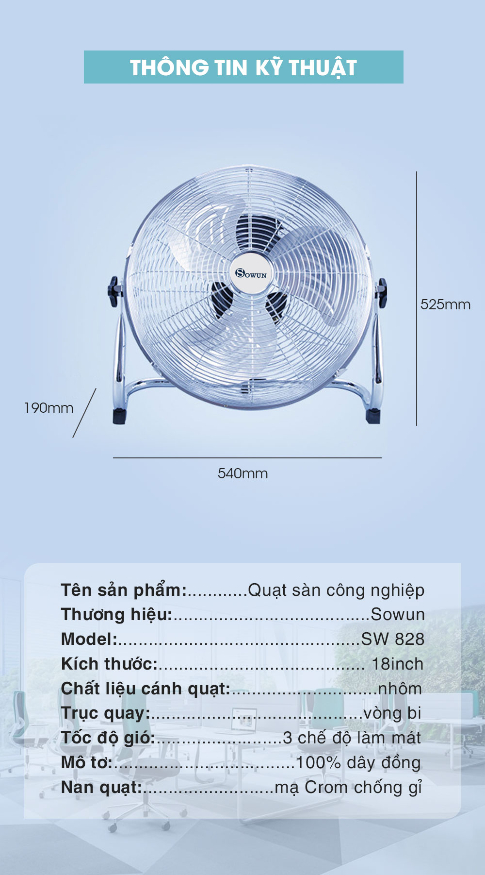 Nếu bạn đang tìm kiếm một sản phẩm làm mát cho mùa hè này thì không nên bỏ qua sản phẩm Quạt sàn công nghiệp Sowun SW 828. Với thiết kế kiểu dáng chân quỳ chắc chắn, cánh quạt nhôm bền nhẹ với kích thước 18 inch cùng động cơ mô tơ đồng công suất 135W và trục xoay vòng bi cho quạt hoạt động bền bỉ, mạnh mẽ, nâng cao khả năng làm mát trên diện rộng, phù hợp với mọi không gian dù là ở nhà, trường học hay các quán ăn, công xưởng,… THÔNG TIN SẢN PHẨM QUẠT 3 CÁNH LÀM BẰNG CHẤT LIỆU NHÔM BỀN, NHẸ CHO LƯU LƯỢNG GIÓ LỚN Khác với các thiết bị quạt công nghiệp có cánh bằng nhựa, dễ bị hư gãy do tác động từ bên ngoài. Quạt sàn công nghiệp Sowun SW 828 có cánh bằng nhôm bền, nhẹ, chắc chắn, khó bị hư hỏng do tác động mạnh từ bên ngoài. Bên cạnh đó, do thiết kế cánh quạt 3 cánh 18 inch làm giảm lực ma sát của không khí, quạt sẽ hoạt động hiệu quả hơn, năng suất hơn và giúp tiết kiệm điện năng. Điều này hoàn toàn phù hợp với nhu cầu sử dụng của mọi người, mọi nhà và những nơi có không gian mở.  TRỤC QUAY VÒNG BI, NÂNG CAO TUỔI THỌ SẢN PHẨM Khác với những quạt sàn công nghiệp khác, quạt sàn công nghiệp Sowun SW 828 có trục quay bằng vòng bi hoạt động bền bỉ với tuổi thọ lên tới 50.0000 giờ ở nhiệt độ cao. MÔ TƠ ĐỒNG NÂNG CAO HIỆU SUẤT HOẠT ĐỘNG Quạt sàn công nghiệp Sowun SW 828 có mô tơ làm bằng 100% dây đồng bền bỉ, giúp dẫn điện tốt, độ bền cao và khả năng vận hành liên tục trong thời gian dài mà không sợ quá tải nhiệt. 3 TỐC ĐỘ GIÓ GIÚP BẠN DỄ DÀNG ĐIỀU CHỈNH THEO NHU CẦU SỬ DỤNG   Sản phẩm tích hợp 3 tốc độ gió từ nhẹ cho đến mạnh nên bạn có thể dễ dàng điều khiển mức gió phù hợp với nhu cầu sử dụng bằng thao tác xoay núm vặn trên hộp động cơ. VẬN HÀNH ÊM ÁI, GIẢM TIẾNG ỒN Chân quạt thiết kế bọc nhựa chống rung lắc giúp làm giảm tiếng ồn hiệu quả. AN TOÀN VỚI NGƯỜI SỬ DỤNG Quạt sàn công nghiệp Sowun SW 828 được thiết kế với đế nâng bằng chất liệu kim loại sơn chống gỉ cao cấp. Chân đế chắc chắn giúp quạt đứng vững trên nhiều bề mặt khác nhau, hạn chế tình trạng nghiêng, đổ làm ảnh hưởng đến hoạt động quay của quạt cũng như an toàn cho người sử dụng.  Lồng quạt được thiết kế an toàn, đặc biệt với gia đình có trẻ nhỏ (hạn chế tình trạng trẻ em nghịch ngợm cho tay vào cánh quạt). Bên cạnh đó, lồng quạt bằng chất liệu kim loại mạ Crom cứng cáp, chống gỉ, bảo vệ quạt trước các tác động mạnh như va đập hay nứt vỡ. Đường kính 45cm