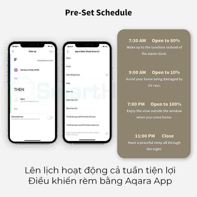 - Lên lịch cho rèm tự động mở vào buổi sáng và tự đóng vào buổi tối