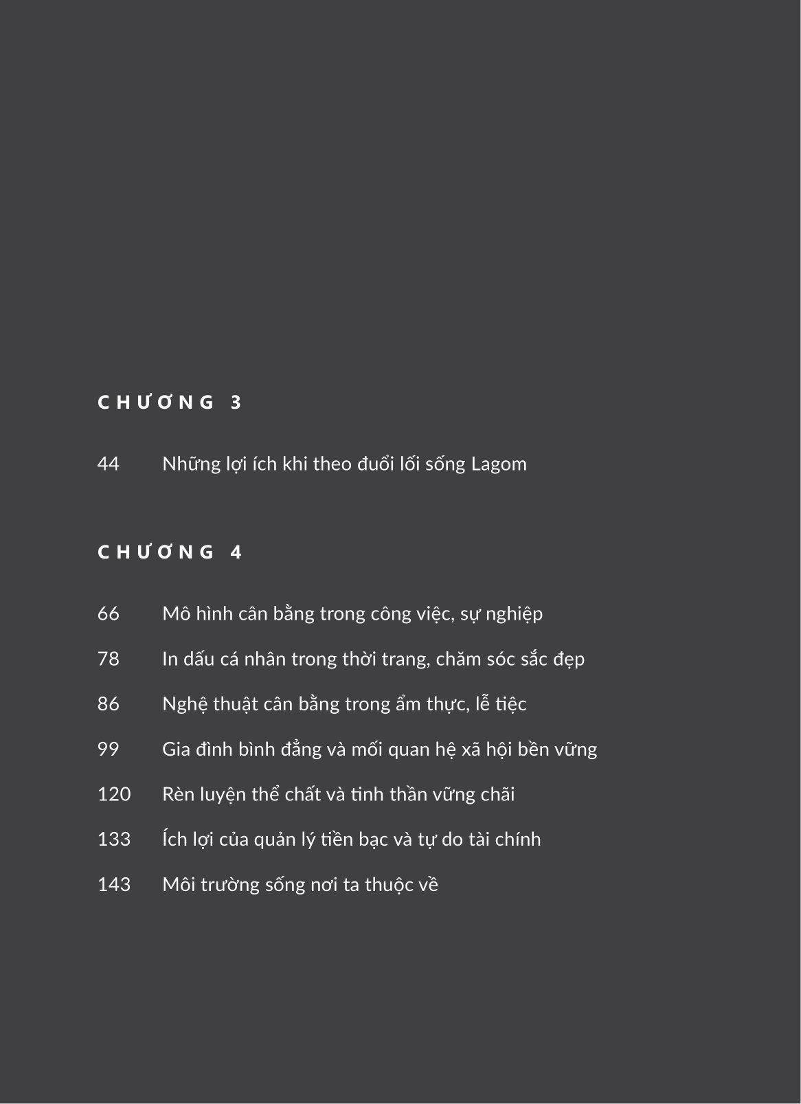 Dù bạn đã từng nghe đến hay còn xa lạ với Lagom thì cuốn sách này vẫn hứa hẹn đem đến cho bạn một góc nhìn rất khác về phong cách sống của người Bắc Âu - nơi được mệnh danh là “Vương quốc Hạnh phúc”. Theo chân hành trình sống, quan sát và chiêm nghiệm của tác giả Uyên Tifi cùng những người bản xứ, cuốn sách đi từ những khái niệm cơ bản nhất của Lagom đến việc ứng dụng triết lý này để đạt được sự cân bằng viên mãn thông qua 7 khía cạnh tiêu biểu: xây dựng sự nghiệp, in dấu cá nhân qua thời trang, chế độ ăn uống lành mạnh, gìn giữ hạnh phúc gia đình, rèn luyện thể chất và tinh thần, quản lý tài chính và bảo vệ môi trường bền vững.