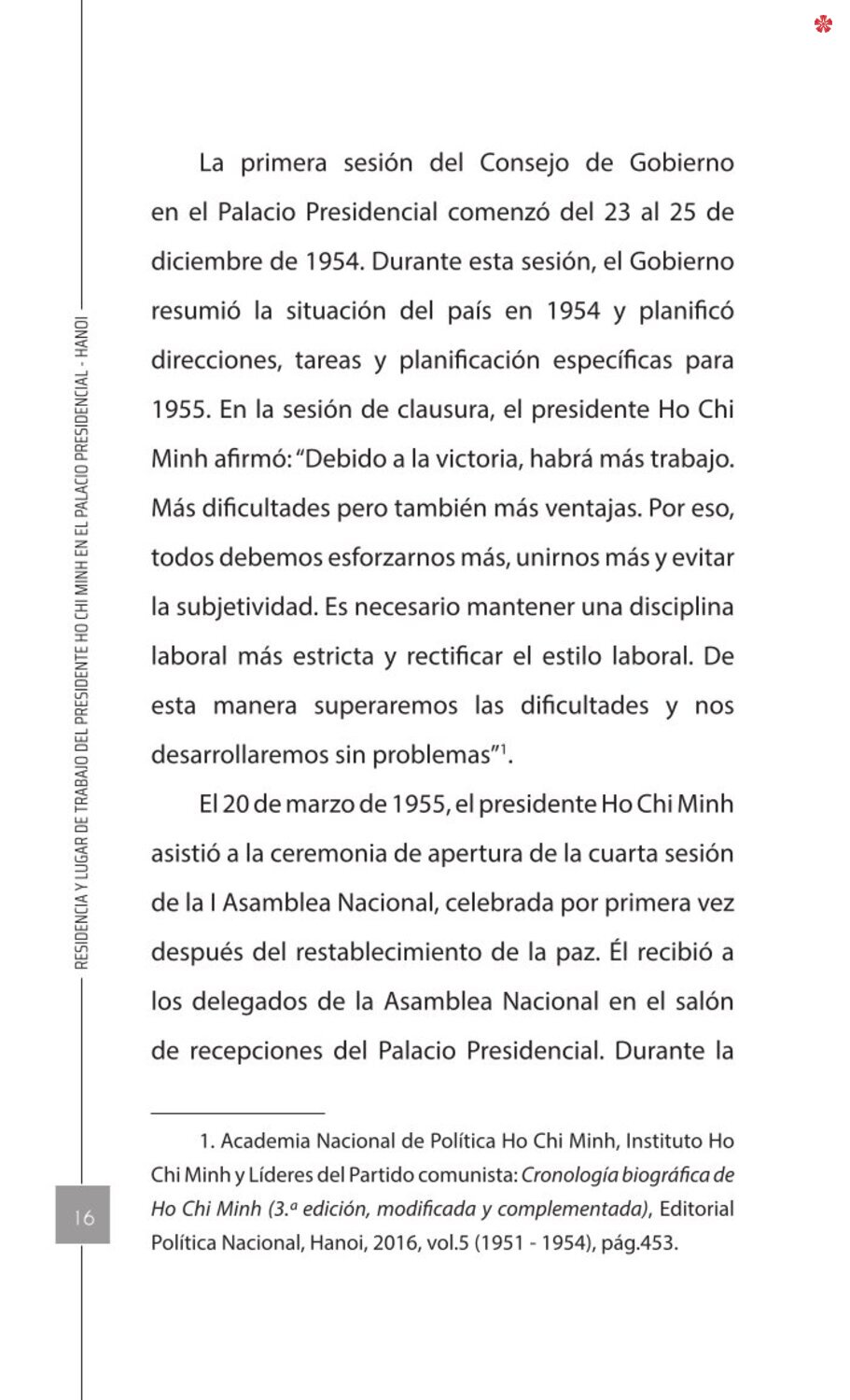 El libro Residencia y lugar de trabajo del presidente Ho Chi Minh en el Palacio Presidencial - Hanoi ofrece a los lectores un recurso valioso que nos ayuda a comprender mejor la vida del amado líder del de la nación vietnamita. El libro recrea de forma realista y lleva al lector a cada pequeño rincón, a cada recuerdo, a cada historia sencilla pero impregnada de significado histórico y humano sobre los lugares asociados al presidente Ho Chi Minh en el Palacio Presidencial como: la Casa 54, la Casa sobre pilotes, la Casa 67, el estanque de peces, el camino de mangos, lentre otros.