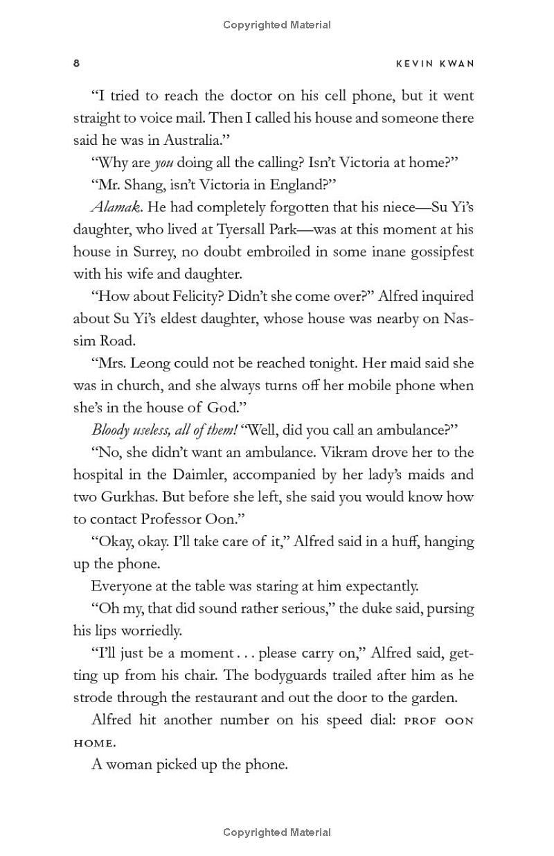 When Nicholas Young hears that his grandmother, Su Yi, is on her deathbed, he rushes to be by her bedside—but he's not alone. The entire Shang-Young clan has convened from all corners of the globe to stake claim on their matriarch’s massive fortune. With each family member vying to inherit Tyersall Park—a trophy estate on 64 prime acres in the heart of Singapore—Nicholas’s childhood home turns into a hotbed of speculation and sabotage. As her relatives fight over heirlooms, Astrid Leong is at the center of her own storm, desperately in love with her old sweetheart Charlie Wu, but tormented by her ex-husband—a man hell bent on destroying Astrid’s reputation and relationship. Meanwhile Kitty Pong, married to China’s second richest man, billionaire Jack Bing, still feels second best next to her new step-daughter, famous fashionista Colette Bing. A sweeping novel that takes us from the elegantly appointed mansions of Manila to the secluded private islands in the Sulu Sea, from a kidnapping at Hong Kong’s most elite private school to a surprise marriage proposal at an Indian palace, caught on camera by the telephoto lenses of paparazzi, Kevin Kwan's hilarious, gloriously wicked new novel reveals the long-buried secrets of Asia's most privileged families and their rich people problems.