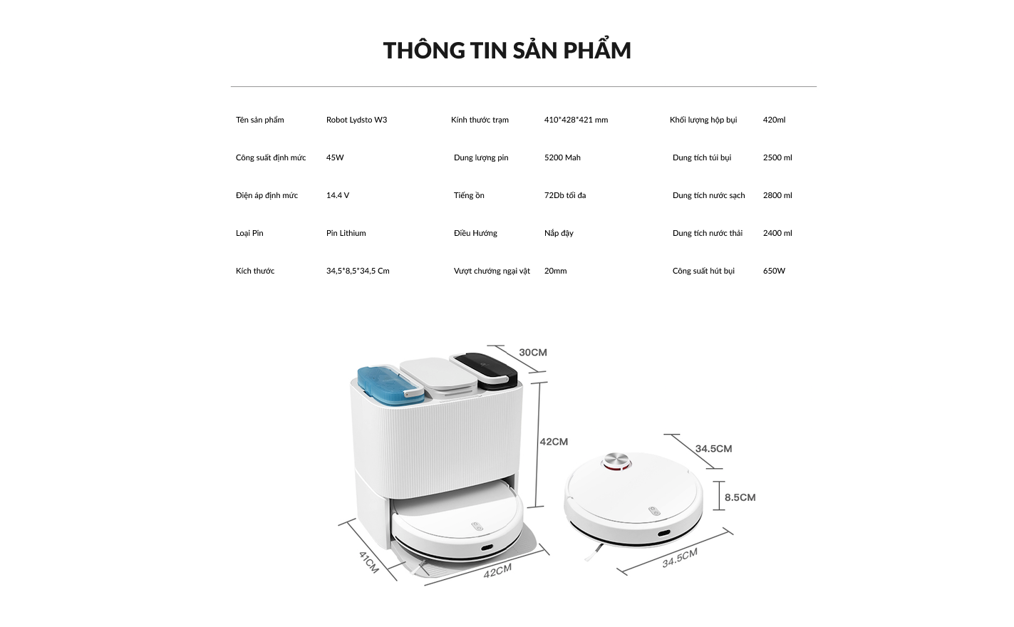 Tích hợp công nghệ Quét laser 3D định vị hệ thống hiển thị bản đồ toàn bộ ngôi nhà. Chốt quét: 2 chiếc Tự động quay về dock sạc, leo dốc 3cm. Thời gian sạc