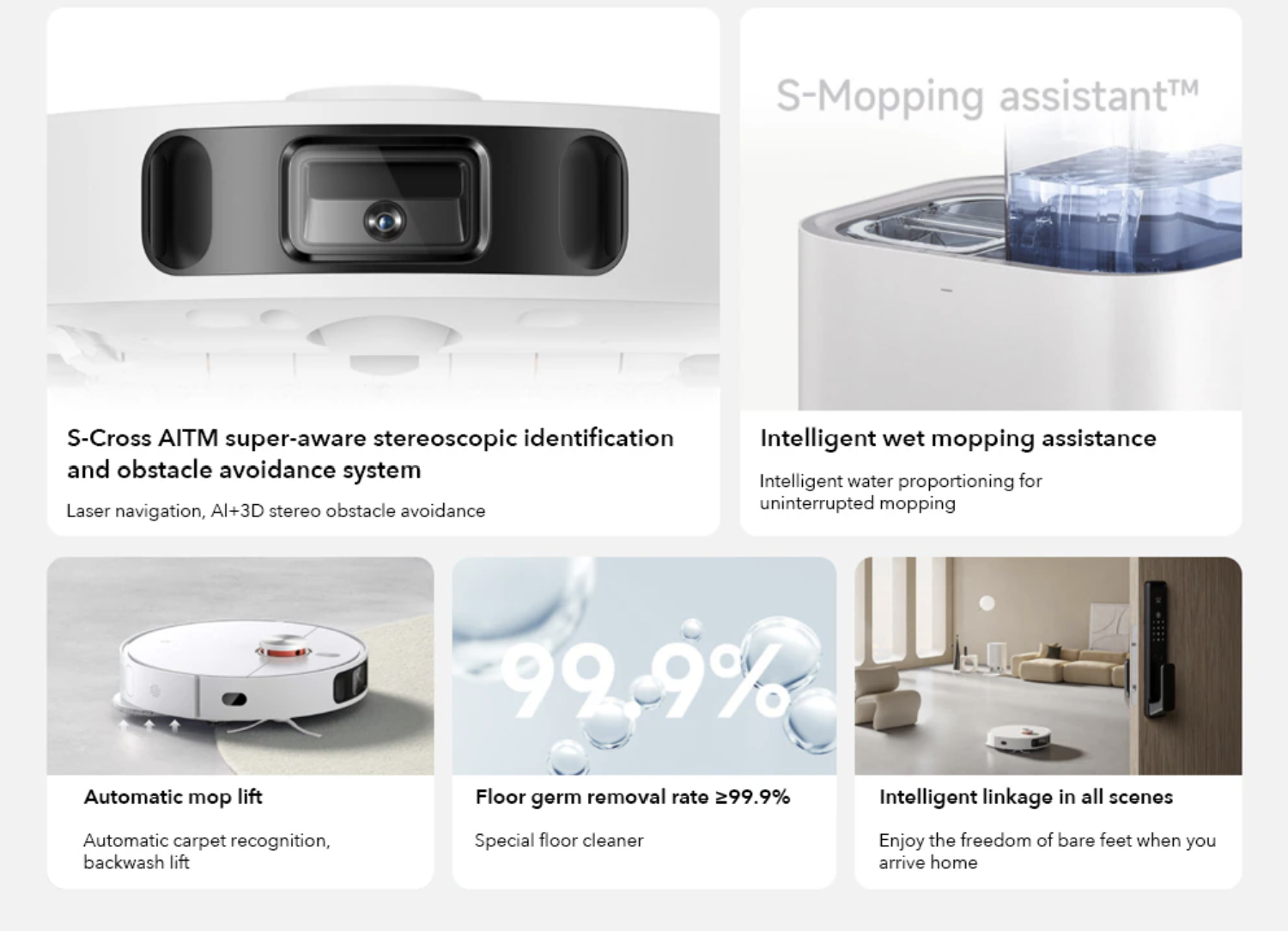 Để quá trình hút và lau diễn ra trơn tru, Máy hút bụi tích hợp camera hỗ trợ hệ thống tránh chướng ngại vật nhận dạng ba chiều S-cross AI . Đối với hệ thống này thuật toán AI có thể cho biết độ chính xác nhận biết ở cấp độ mét. Xác định các chướng ngại vật khác nhau và tránh chướng ngại vật một cách nhanh chóng, chính xác và ổn định.