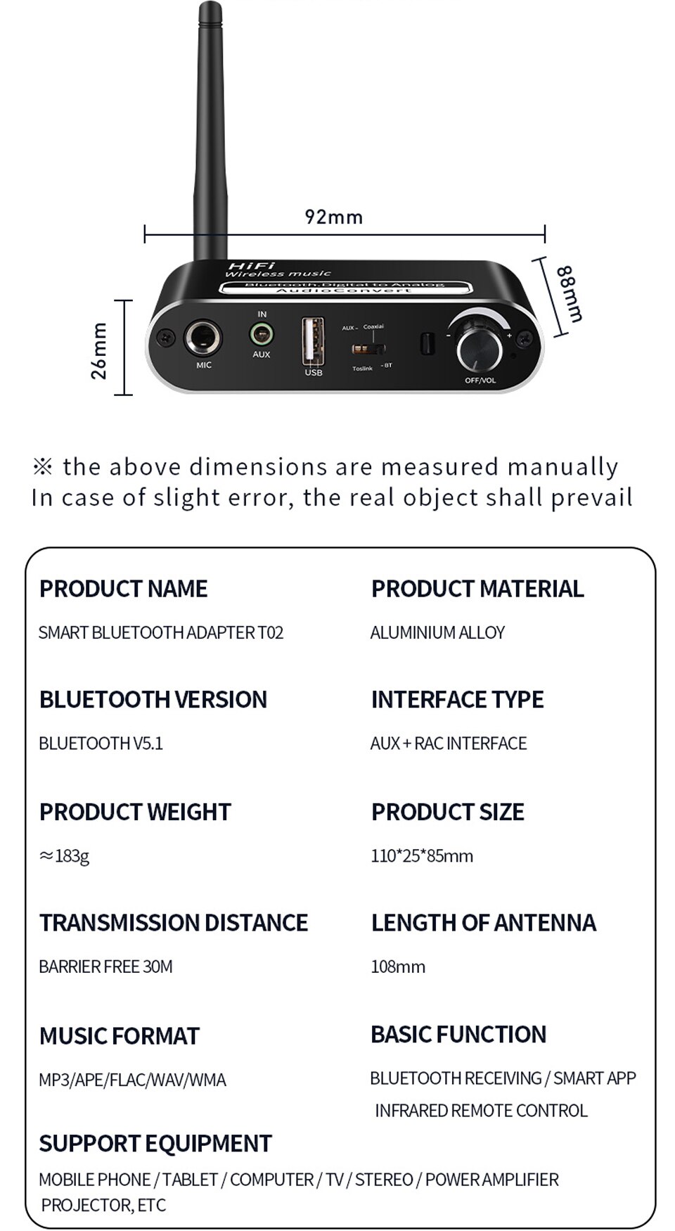 Thông số kỹ thuật sản phẩm: Tên sản phẩm: Bộ điều hợp âm thanh Bluetooth hiển thị kỹ thuật số Mẫu sản phẩm: M5 Phiên bản sản phẩm:Tiêu chuẩn/Điều khiển từ xa Phiên bản Bluetooth: