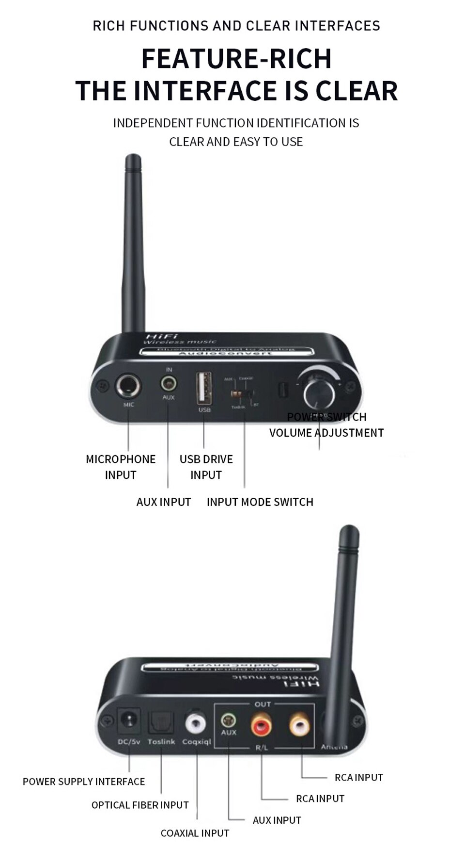 Tính năng: Bộ thu âm thanh tương thích với Bluetooth, bộ chuyển đổi âm thanh kỹ thuật số sang tương tự, bộ điều hợp phát lại đĩa flash USB. Có dây thành không dây, biến