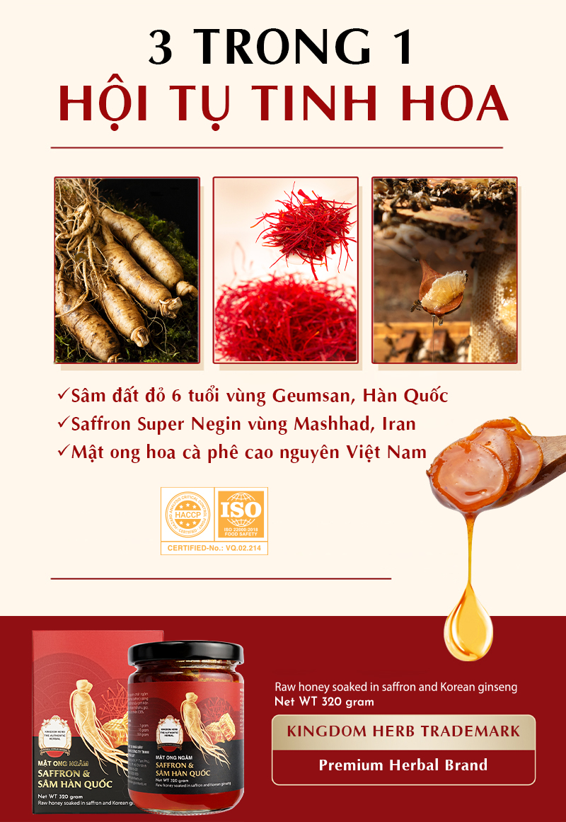 - Tăng cường sức khỏe và xua tan mệt mỏi, nâng cao sức đề kháng Cam kết của saffron ngâm mật ong Kingdom Herb: