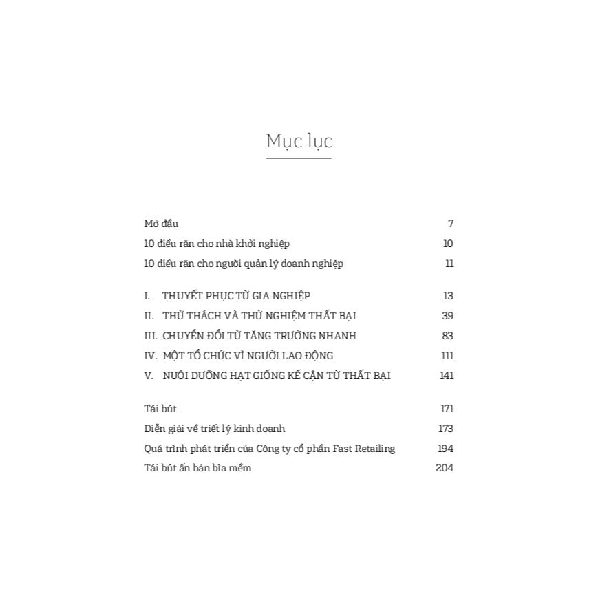 Cuốn sách cũng chỉ ra điểm yếu của các doanh nghiệp Nhật Bản thua trên thương trường thế giới vì đã không phân tích những nguyên nhân dẫn đến thất bại nhỏ. Ông Tadashi Yanai nhấn mạnh sự quan trọng của việc phân tích nguyên nhân thất bại, từ đó suy nghĩ thấu đáo cho chiến lược tiếp theo.