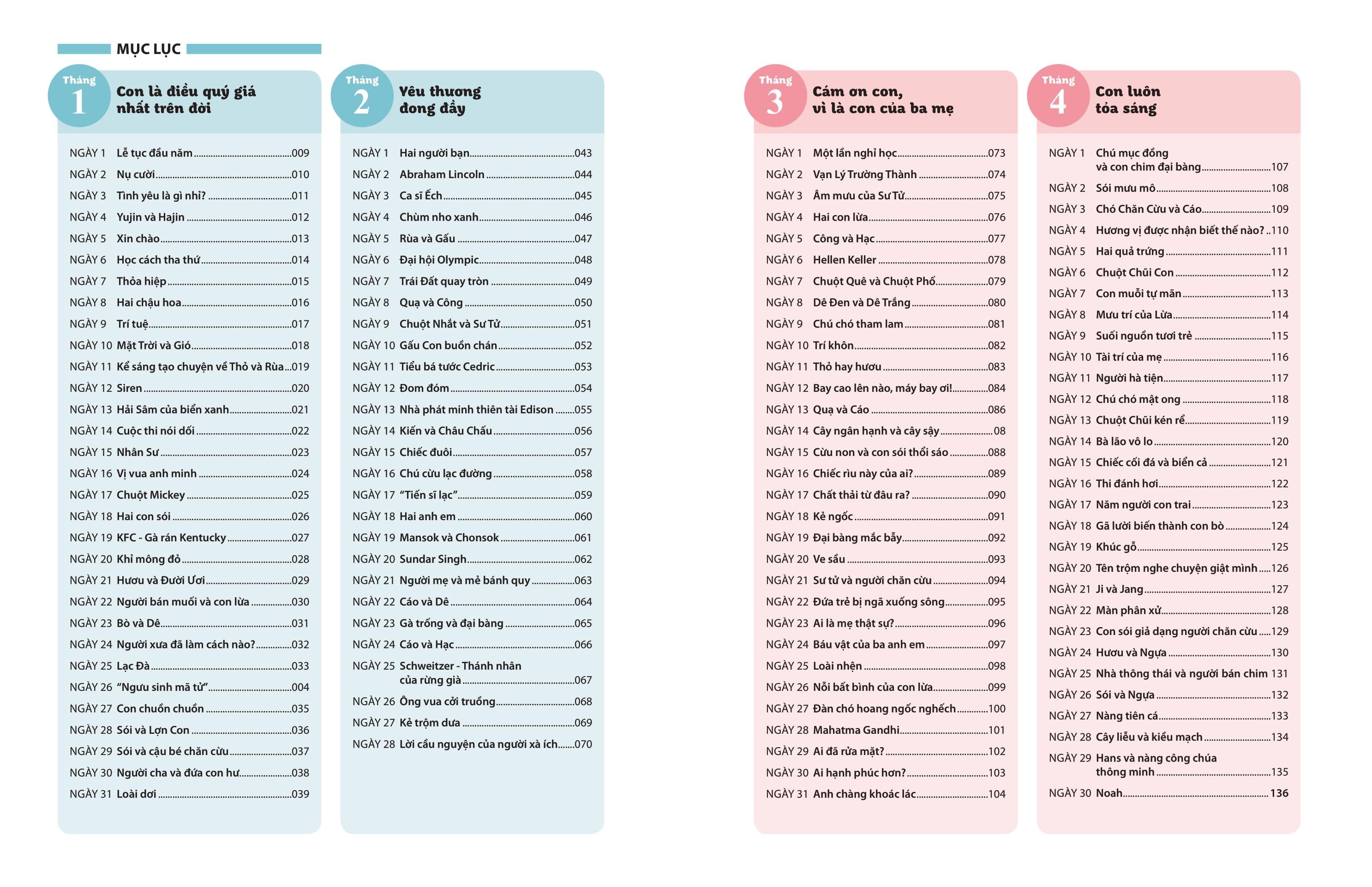 Bộ sách này gồm 2 tập, tập hợp 365 truyện kể lấy cảm hứng từ nhiều chủ đề, câu chuyện và các nền văn hóa trên khắp thế giới, có thể đọc liên tục trong suốt một năm. Mỗi câu chuyện lại gửi gắm những bài học ý nghĩa khác nhau để cha mẹ và các em nhỏ cùng khám phá.