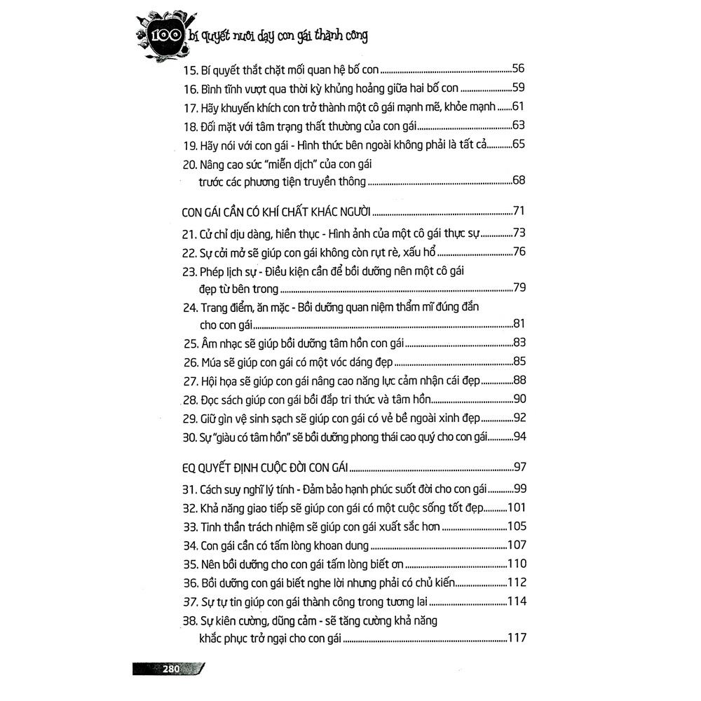 100 bí quyết nuôi dạy con gái thành công dựa vào đặc điểm giới tính và tâm lý của con gái để đề cập đến rất nhiều phương diện như cuộc sống, học tập, tính cách, tâm trạ của con gái
