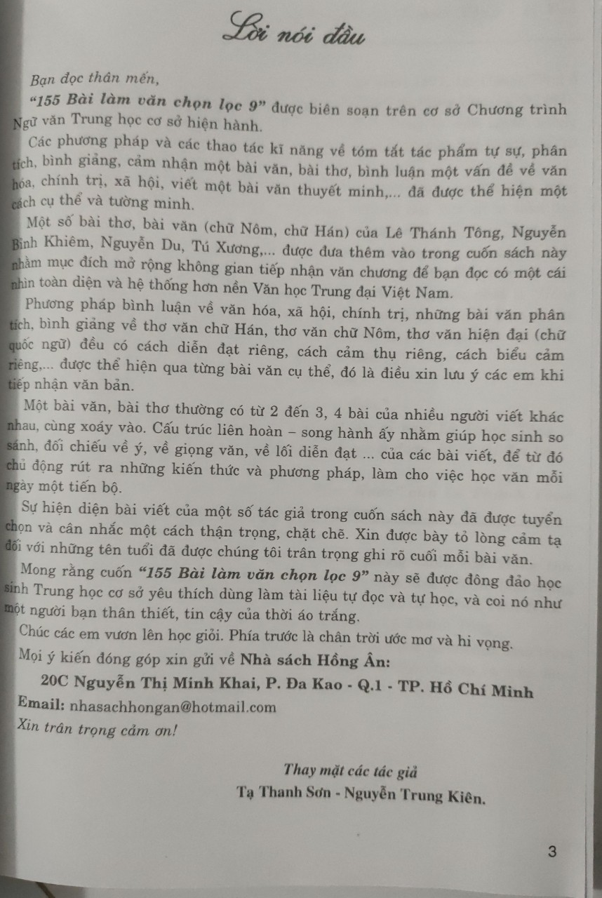 Sách - 155 bài làm văn chọn lọc 9 + ha Bạn đọc thân mến, “155 Bài làm văn chọn lọc 9” được biên soạn trên cơ sở Chương trình Ngữ văn Trung học cơ