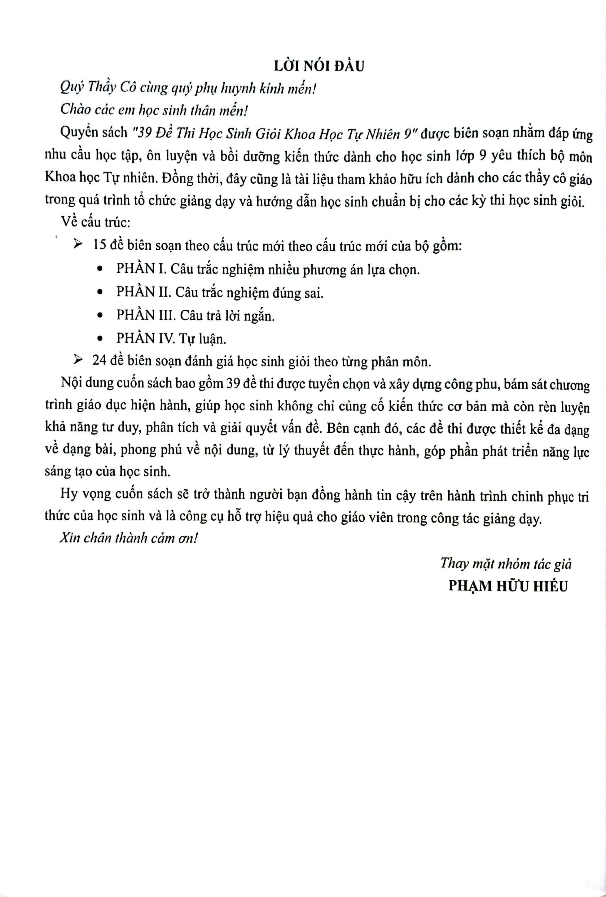 Quyển sách "39 Đề Thi Học Sinh Giỏi Khoa Học Tự Nhiên 9” được biên soạn nhằm đáp ứng nhu cầu học tập, ôn luyện và bồi dưỡng kiến thức dành cho học sinh lớp 9 yêu thích bộ môn Khoa học Tự nhiên. Đồng thời, đây cũng là tài liệu tham khảo hữu ích dành cho các thầy cô giáo trong quá trình tổ chức giảng dạy và hướng dẫn học sinh chuẩn bị cho các kỳ thi học sinh giỏi. Về cấu trúc: