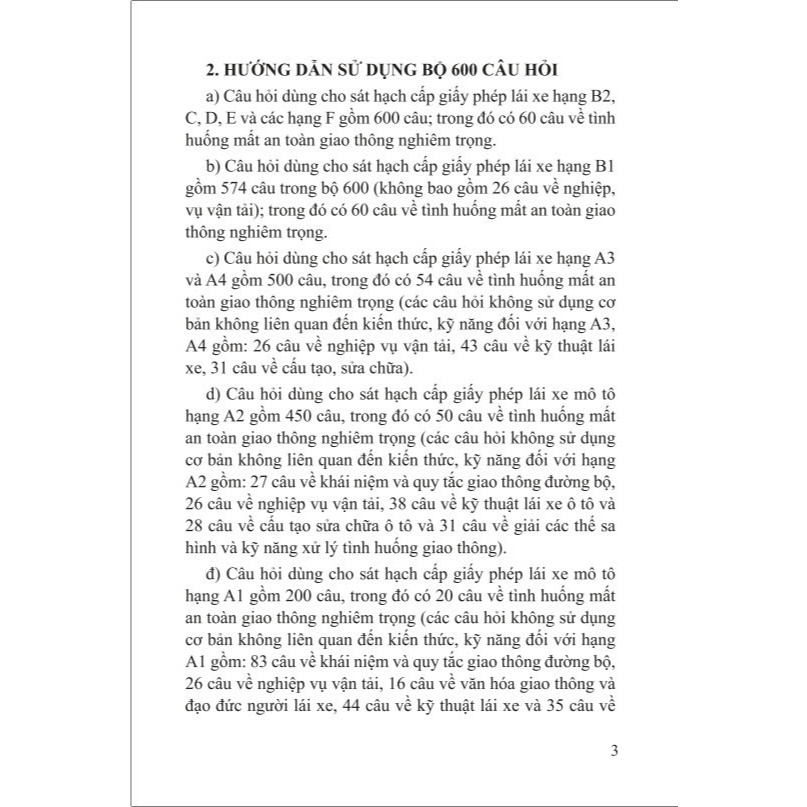 (Theo Văn bản số 1883/TCĐBVN-QLPT&NL về việc sử dụng bộ 600 câu hỏi dùng để sát hạch lái xe cơ giới đường bộ ngày 30/3/2020 của Tổng cục Đường bộ Việt Nam) 1. KẾT CẤU BỘ 600 CÂU HỎI