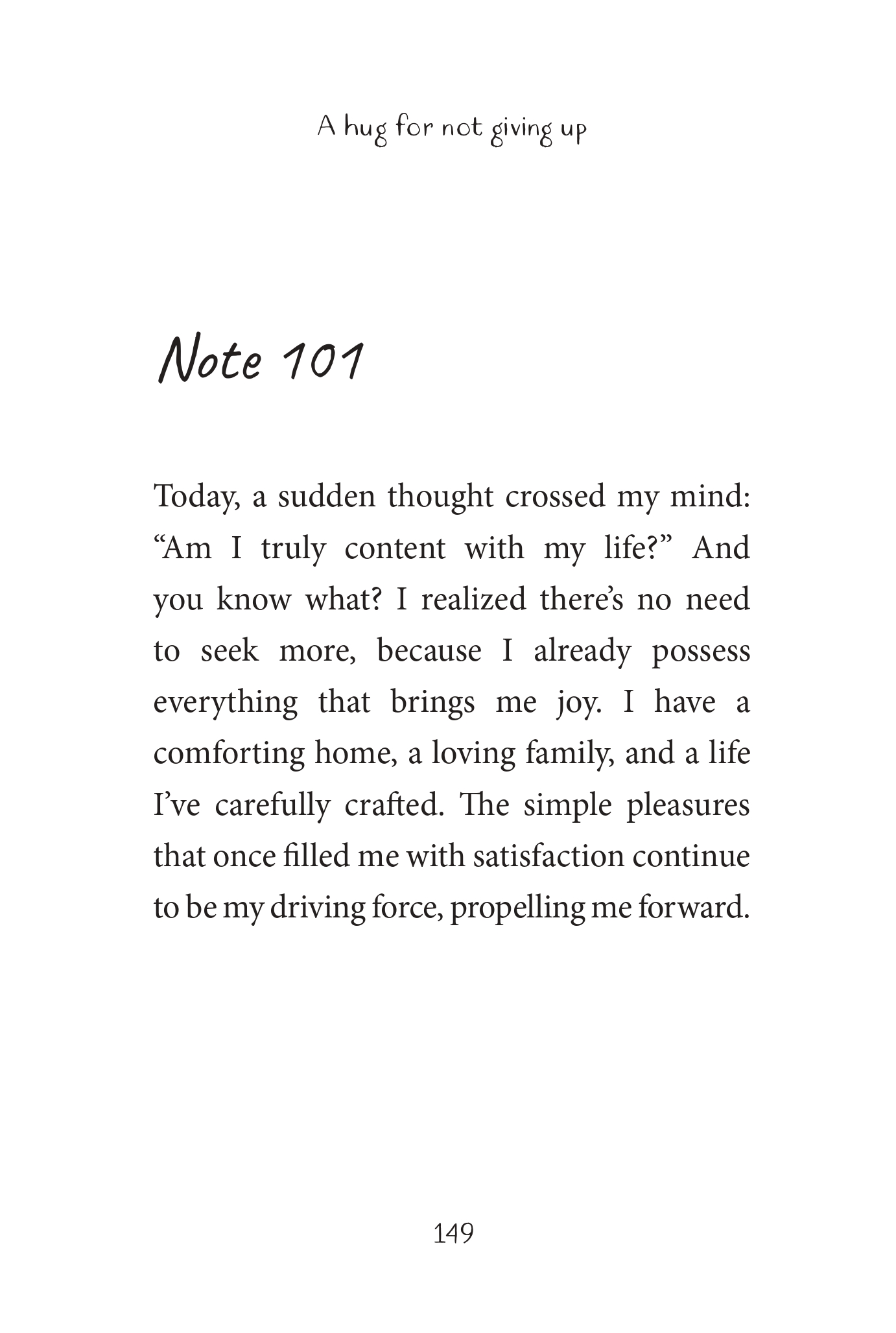 Nhận được sức mạnh từ cái ôm, trong cuốn sách song ngữ “A hug for not giving up - Gửi cậu một cái ôm vì đã không bỏ cuộc” tác giả có viết: “Mong bạn đừng quên rằng, giữa bao la cuộc đời này bạn không hề cô đơn. Gia đình vẫn ở đó để bạn trở về mỗi khi lạc lõng. Vẫn có những người bạn sẵn sàng ngồi nghe bạn tỉ tê. Vậy nên đừng bỏ cuộc khi thất bại, đừng oán trách khi gặp bất công, cũng đừng tự coi bản thân mình là một kẻ cô độc không nơi nương tựa.”