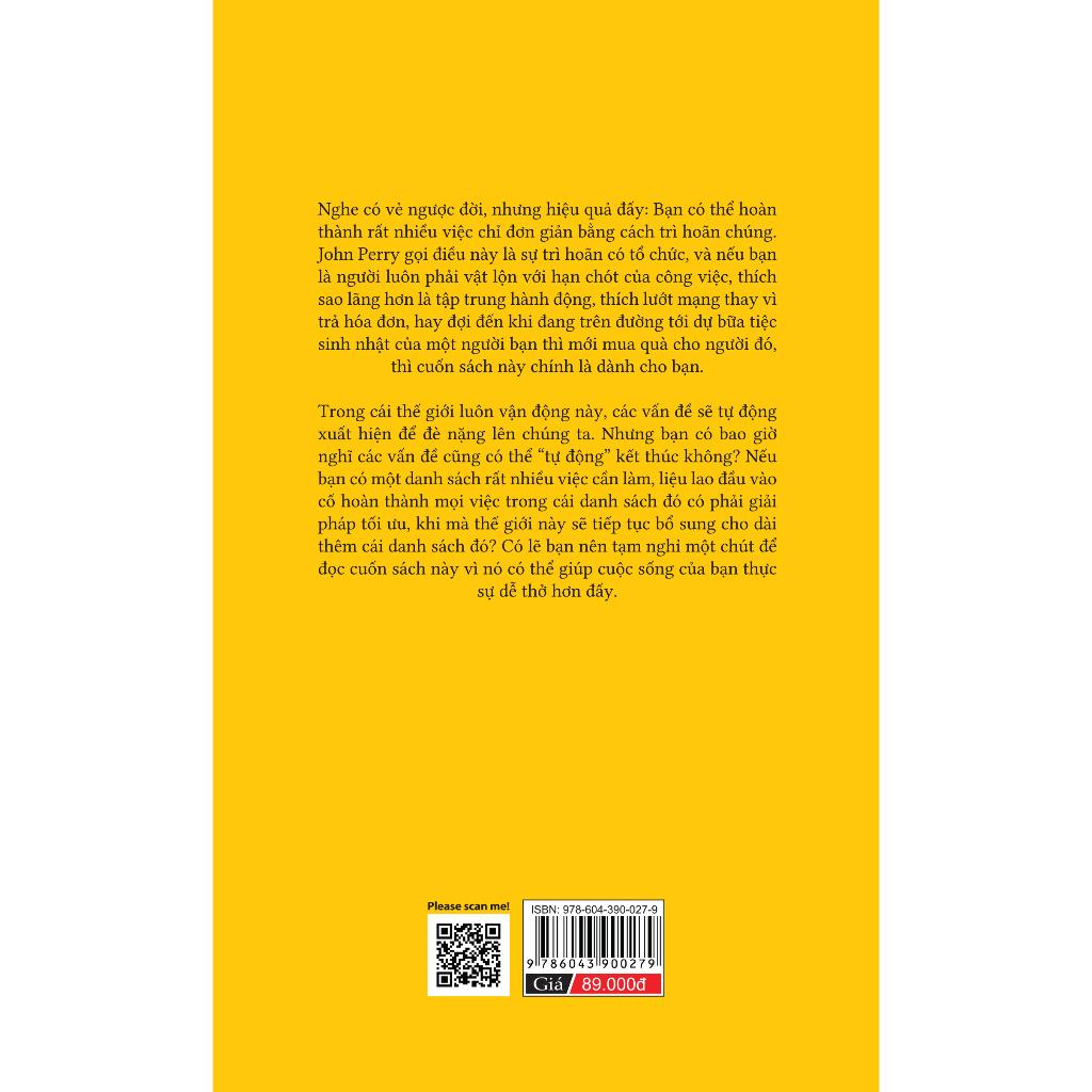 - TÓM TẮT NỘI DUNG Nghe có vẻ ngược đời, nhưng hiệu quả đây: Bạn có thể hoàn thành rất nhiều việc chỉ đơn giản bằng cách trì hoãn chúng. John Perry gọi điều này là sự trì hoãn có tổ chức và nếu bạn là người luôn phải vật lộn với hạn chót của công việc, thích sao lãng hơn là tập trung hành động, thích lướt mạng thay vì trả hóa đơn, hay đơi đến khi đang trên đường tới dự bữa tiệc sinh nhật của một người bạn thì mới mua quà cho người đó, thì cuốn sách này chính là dành cho bạn.
