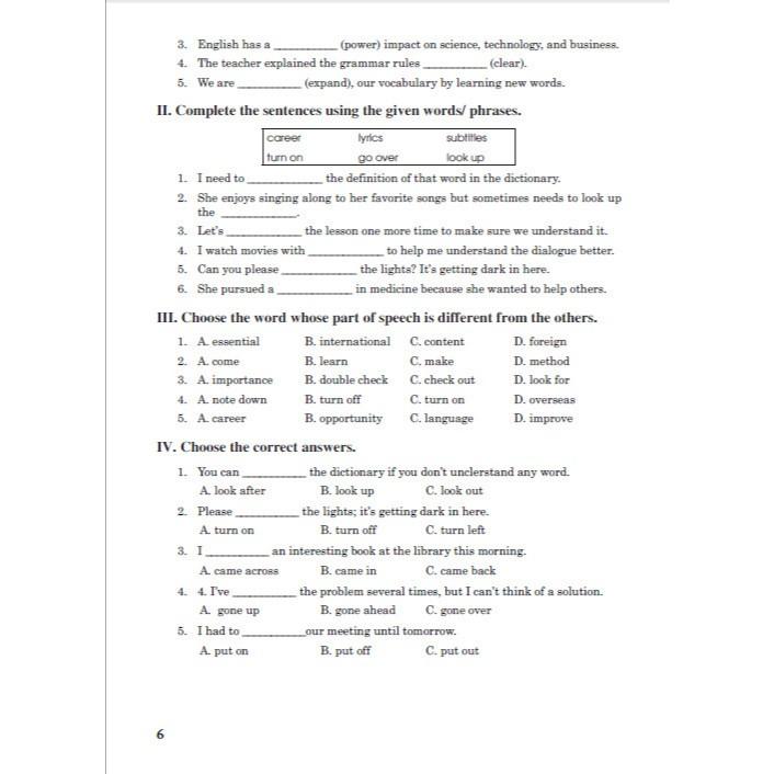B. Vocabulary: Bao gồm các bài tập về từ vựng