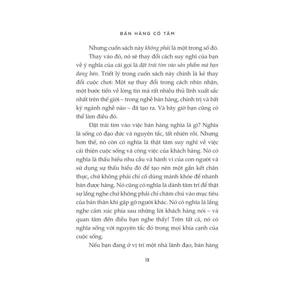 Cuốn sách này sẽ thay đổi suy nghĩ của bạn về cách thức bán hàng từ trước tới nay, đưa bạn đến một ý nghĩa mới của việc bán hàng, được tác giả gọi là bán hàng có tâm.