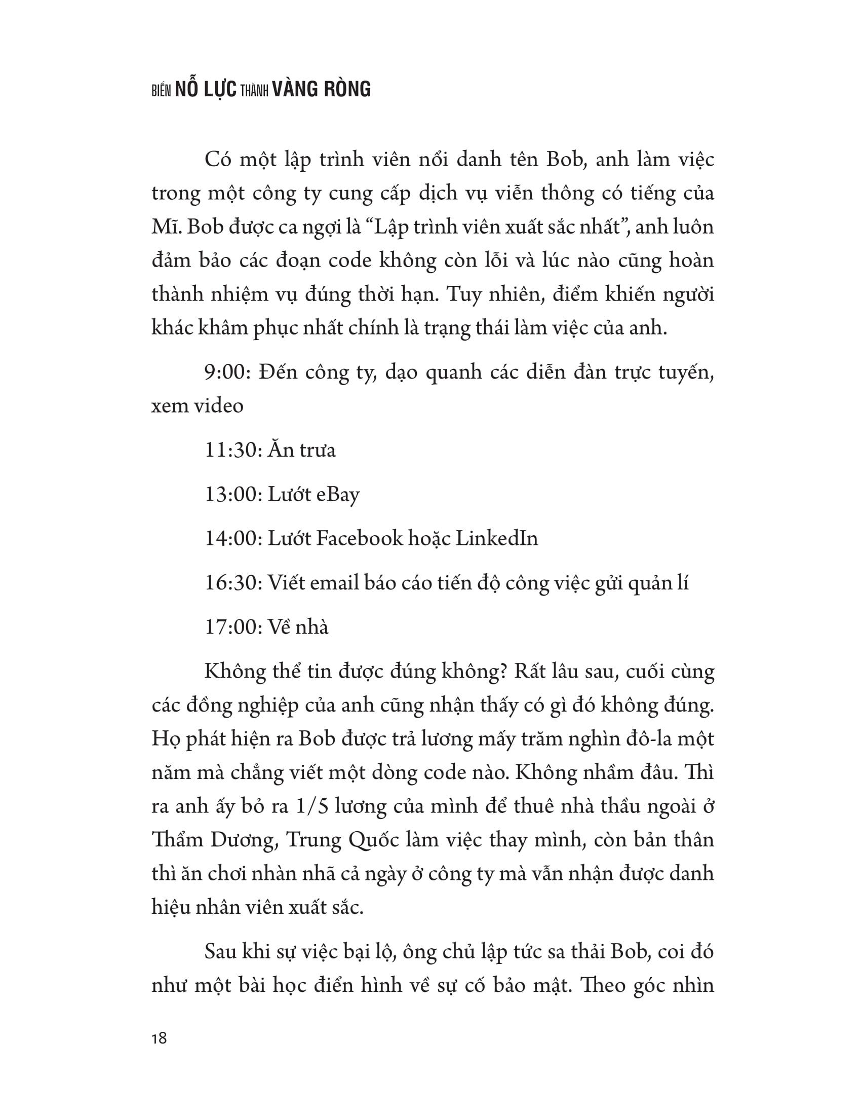 - Việc bạn làm sau giờ làm việc quyết định sự chênh lệch giữa bạn và người khác Trong cuốn sách Biến Nỗ Lực Thành Vàng Ròng, tác giả Lâm Công Tử nói về những chuyện mà bạn quen thuộc hoặc từng trải qua nơi công sở. Trong đó không ít kinh nghiệm thực tế kết hợp với logic và tư duy mới mẻ đáng để ta học hỏi, hỗ trợ bạn nâng cao chất lượng cuộc sống nơi công sở. Thời gian sau khi tan sở là chiến trường kéo giãn sự chênh lệch giữa chúng ta. Đa số người có nguồn tài nguyên lớn hơn so với bạn đồng trang lứa đều có điểm chung là cách họ nghiêm túc tận dụng thời gian sau khi tan sở. Thậm chí có người còn duy trì trạng thái làm việc quanh năm suốt tháng, coi đó như một thói quen. Biên giới nhận thức của bản thân càng lớn thì cơ hội tiềm tàng càng nhiều. Dù ở giai đoạn nào trong cuộc đời, chúng ta đều có chung một nỗi băn khoăn: Tại sao cơ hội chẳng bao giờ đến với m.ình? Trên thực tế, trong suốt cuộc đời m.ình, chúng ta sẽ gặp được rất nhiều bước ngoặt. Tuy nhiên đại đa số chúng ta lại thường không phán đoán được cơ hội, ngay cả khi phát hiện ra cũng không biết cách nắm bắt. Vậy nên chúng ta cần sử dụng công cụ tư duy một cách có ý thức, giúp bản thân có thể đưa ra những quyết định có lợi nhất cho tương lai.