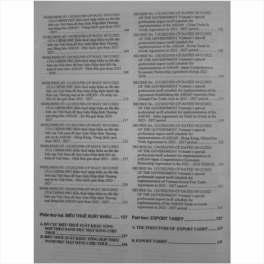 - Toàn bộ sách bìa mềm khổ lớn 20 x 28 cm phân phối bởi Nhà sách Nam Việt đều được bọc sách Plastic MIỄN PHÍ và xuất hóa đơn điện tử đầy đủ, nhanh chóng. …/… Lời giới thiệu: Nhằm triển khai cam kết thuế xuất nhập khẩu của Việt Nam trong các Hiệp định Thương mại, Hiệp định Đối tác kinh tế, ngày 30/12/2022, Chính phủ đã ký ban hành 16 nghị định về biểu thuế xuất khẩu ưu đãi, biểu thuế nhập khẩu ưu đãi đặc biệt của Việt Nam giai đoạn 2022-2027. Nội dung của 16 nghị định này thống nhất với danh mục hàng hóa xuất khẩu, nhập khẩu Việt Nam theo AHTN 2022 quy định tại Thông tư số 31/2022/TT-BTC ngày 08/6/2022 của Bộ Tài chính. 16 Nghị định mới được ban hành gồm: Nghị định 112/2022/NĐ-CP ngày 30/12/2022 về Biểu thuế nhập khẩu ưu đãi đặc biệt của Việt Nam để thực hiện Hiệp định Thương mại tự do giữa Việt Nam – Chi Lê giai đoạn 2022-2027. Nghị định số 113/2022/NĐ-CP ngày 30/12/2022 Biểu thuế nhập khẩu ưu đãi đặc biệt của Việt Nam để thực hiện Hiệp định Thương mại tự do giữa một bên là nước Cộng hòa xã hội chủ nghĩa Việt Nam và bên kia là Liên minh Kinh tế Á – Âu và các quốc gia thành viên giai đoạn 2022 – 2027. Nghị định số 114/2022/NĐ-CP ngày 30/12/2022 Biểu thuế nhập khẩu ưu đãi đặc biệt của Việt Nam để thực hiện Hiệp định Thương mại giữa Chính phủ nước Cộng hòa xã hội chủ nghĩa Việt Nam và Chính phủ nước Cộng hòa Cuba giai đoạn 2022 – 2027. Nghị định số 115/2022/NĐ-CP ngày 30/12/2022 Biểu thuế xuất khẩu ưu đãi, Biểu thuế nhập khẩu ưu đãi đặc biệt của Việt Nam để thực hiện Hiệp định Đối tác Toàn diện và Tiến bộ xuyên Thái Bình Dương giai đoạn 2022 – 2027. Nghị định số 116/2022/NĐ-CP ngày 30/12/2022 Biểu thuế xuất khẩu ưu đãi, Biểu thuế nhập khẩu ưu đãi đặc biệt của Việt Nam để thực hiện Hiệp định Thương mại tự do giữa Cộng hòa xã hội chủ nghĩa Việt Nam và Liên minh Châu Âu giai đoạn 2022 – 2027. Nghị định số 117/2022/NĐ-CP ngày 30/12/2022 Biểu thuế xuất khẩu ưu đãi, Biểu thuế nhập khẩu ưu đãi đặc biệt của Việt Nam để thực hiện Hiệp định Thương mại tự do giữa Cộng hòa xã hội chủ nghĩa Việt Nam và Liên hiệp Vương quốc Anh và Bắc Ireland giai đoạn 2022 – 2027. Nghị định số 118/2022/NĐ-CP ngày 30/12/2022 Biểu thuế nhập khẩu ưu đãi đặc biệt của Việt Nam để thực hiện Hiệp định Thương mại hàng hóa ASEAN – Trung Quốc giai đoạn 2022 – 2027. Nghị định số 119/2022/NĐ-CP ngày 30/12/2022 Biểu thuế nhập khẩu ưu đãi đặc biệt của Việt Nam để thực hiện Hiệp định Thương mại Hàng hóa ASEAN – Hàn Quốc giai đoạn 2022 – 2027. Nghị định số 120/2022/NĐ-CP ngày 30/12/2022 Biểu thuế nhập khẩu ưu đãi đặc biệt của Việt Nam để thực hiện Hiệp định Đối tác kinh tế toàn diện ASEAN – Nhật Bản giai đoạn 2022 – 2028. Nghị định số 121/2022/NĐ-CP ngày 30/12/2022 Biểu thuế nhập khẩu ưu đãi đặc biệt của Việt Nam để thực hiện Hiệp định thành lập Khu vực Thương mại tự do ASEAN – Australia – New Zealand giai đoạn 2022 – 2027. Nghị định số 122/2022/NĐ-CP ngày 30/12/2022 Biểu thuế nhập khẩu ưu đãi đặc biệt của Việt Nam để thực hiện Hiệp định Thương mại hàng hóa ASEAN – Ấn Độ giai đoạn 2022 – 2027. Nghị định số 123/2022/NĐ-CP ngày 30/12/2022 Biểu thuế nhập khẩu ưu đãi đặc biệt của Việt Nam để thực hiện Hiệp định Thương mại Tự do ASEAN – Hồng Kông, Trung Quốc giai đoạn 2022 – 2027. Nghị định số 124/2022/NĐ-CP ngày 30/12/2022 Biểu thuế nhập khẩu ưu đãi đặc biệt của Việt Nam để thực hiện Hiệp định Đối tác kinh tế Việt Nam – Nhật Bản giai đoạn 2022 – 2028. Nghị định số 125/2022/NĐ-CP ngày 30/12/2022 Biểu thuế nhập khẩu ưu đãi đặc biệt của Việt Nam để thực hiện Hiệp định Thương mại Tự do Việt Nam – Hàn Quốc giai đoạn 2022 – 2027. Nghị định số 126/2022/NĐ-CP ngày 30/12/2022 Biểu thuế nhập khẩu ưu đãi đặc biệt của Việt Nam để thực hiện Hiệp định Thương mại Hàng hóa ASEAN giai đoạn 2022 – 2027. Nghị định số 127/2022/NĐ-CP ngày 30/12/2022 Biểu thuế nhập khẩu ưu đãi đặc biệt của Việt Nam để thực hiện Hiệp định Thương mại giữa Chính phủ nước Cộng hòa xã hội chủ nghĩa Việt Nam và Chính phủ nước Cộng hòa dân chủ nhân dân Lào từ ngày 30/12/2022 đến ngày 4/10/2023. Ngoài ra, ngày 31/05/2023 Chính phủ cũng ban hành Nghị định số 26/2023/NĐ-CP về Biểu thuế xuất khẩu, biểu thuế nhập khẩu ưu đãi, danh mục hàng hóa và mức thuế tuyệt đối, thuế hỗn hợp, thuế nhập khẩu ngoài hạn ngạch thuế quan và Quyết định số 15/2023/QĐ-TTg Quy định việc áp dụng thuế suất thông thường đối với hàng hóa nhập khẩu. …/… Nhằm tạo điều kiện thuận lợi cho các cơ quan hải quan và doanh nghiệp cập nhật và áp dụng mức thuế suất đối với hàng hóa xuất khẩu – nhập khẩu mới một cách kịp thời để thực hiện tốt chính sách thuế được Nhà nước ban hàn