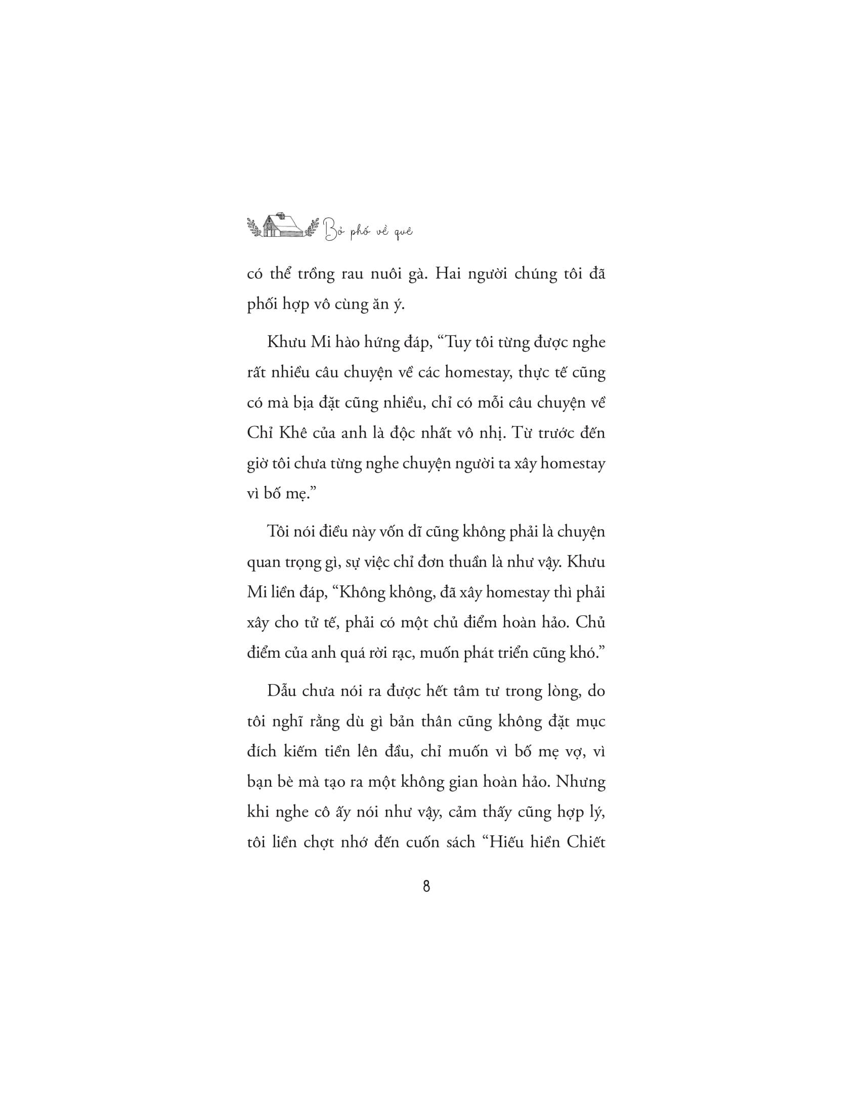 Cuốn sách không chỉ là một lời nhắn nhủ về việc tìm lại giá trị bản thân, mà còn là tiếng nói đồng cảm với những bạn trẻ hiện đại đang khát khao "bỏ phố" để tìm kiếm sự cân bằng và ý nghĩa mới trong cuộc sống. Thông qua câu chuyện của m.ình, Chu Tử Nhất mang đến một góc nhìn đầy cảm hứng về lối sống gần gũi với thiên nhiên: một cuộc sống chậm rãi, nhưng sâu sắc và giàu kết nối. Anh học cách hòa m.ình vào nhịp sống bình dị của nông thôn, xây dựng mối quan hệ chân thành với những người dân bản địa, và từ đó, khám phá cách biến cuộc sống ở quê nhà không chỉ là sự tồn tại, mà còn là sự thăng hoa đầy ý nghĩa.