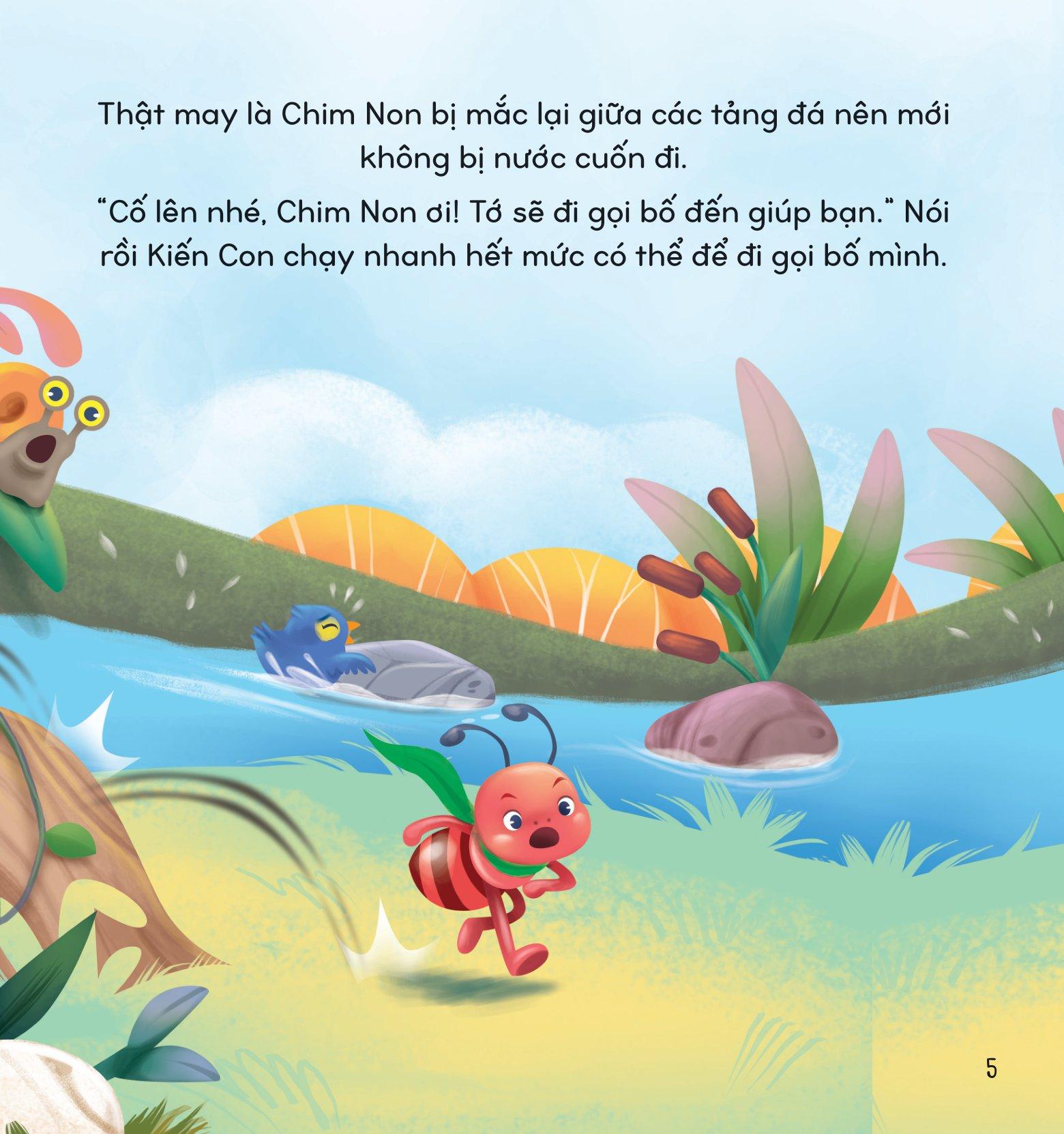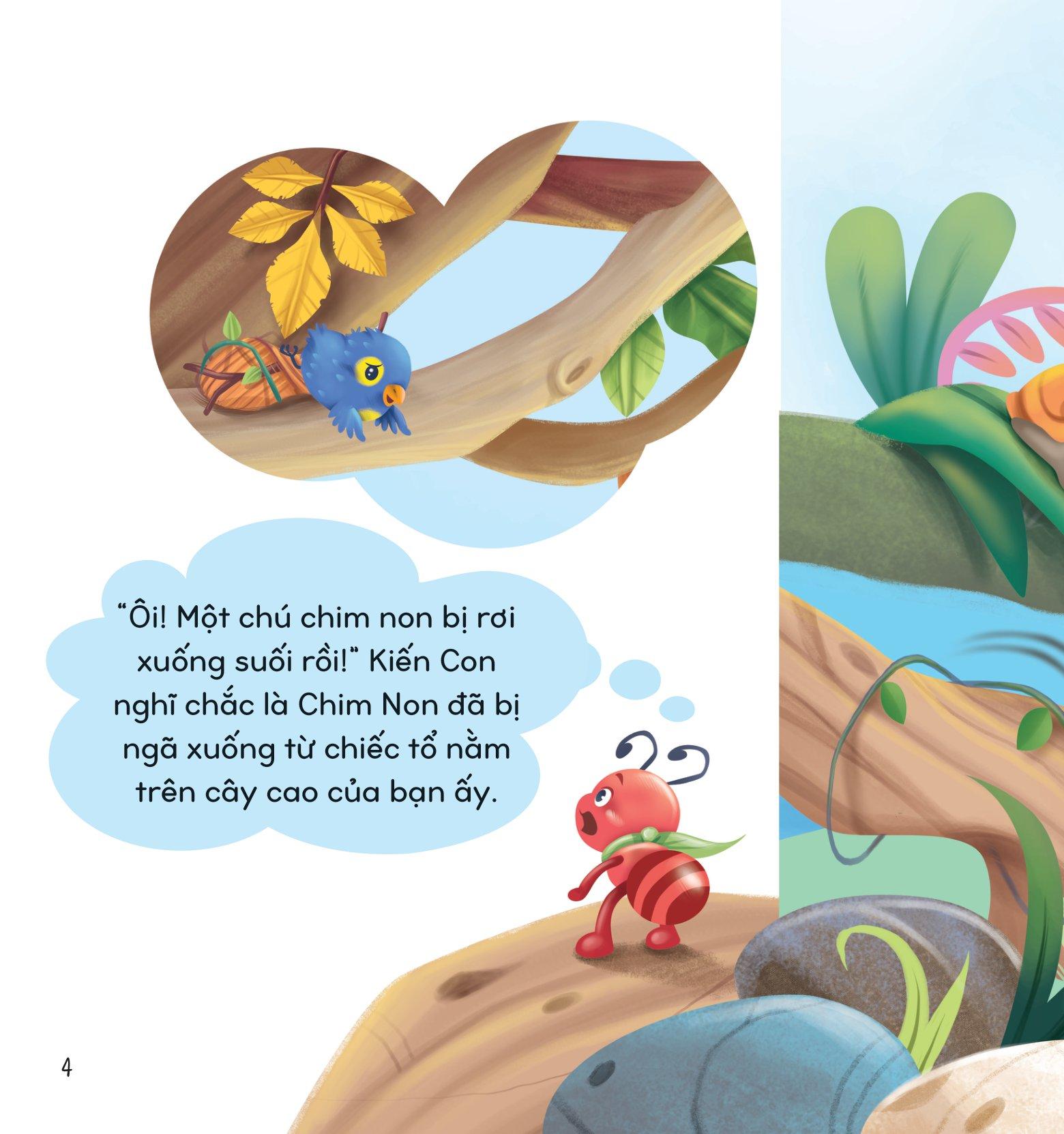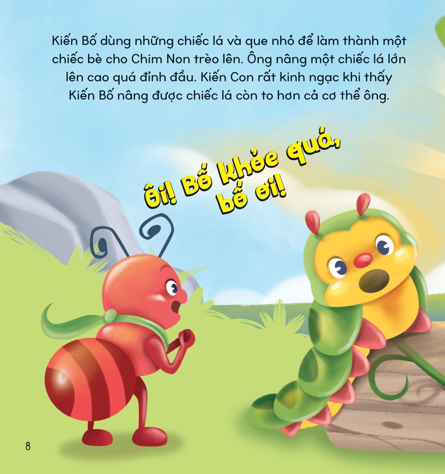 Trong ngày hội của những chú kiến, khi Kiến Con đang chơi đùa thì bỗng nghe thấy tiếng kêu cứu. Thì ra bạn Chim Non đã bị rơi xuống suối. Kiến Con lập tức gọi bố mình đến giúp. Tuy Kiến Bố rất khỏe mạnh nhưng hai bố con bạn ấy lại nhỏ bé hơn bạn Chim Non rất nhiều. Họ phải làm thế nào để cứu được bạn Chim Non đây nhỉ? Chúng mình hãy cùng theo dõi câu chuyện thú vị và đầy cảm động này để tìm ra câu trả lời nhé! Thông qua câu chuyện, em sẽ còn học hỏi được nhiều đức tính tốt đẹp từ Kiến Bố nữa đấy.
