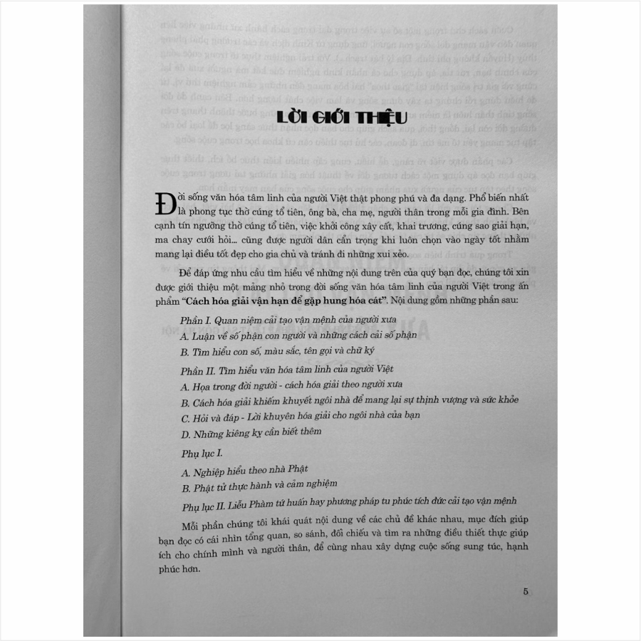 Để đáp ứng nhu cầu tìm hiểu về những nội dung trên của quý bạn đọc, chúng tôi xin được giới thiệu một mảng nhỏ trong đời sống văn hóa tâm linh của người Việt trong ấn phẩm “Cách Hóa Giải Vận Hạn Để Gặp Hung Hóa Cát”