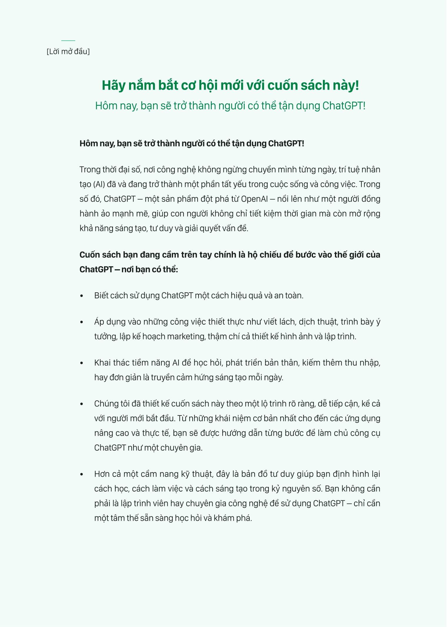 Trong thời đại AI phát triển nhanh chóng, việc làm chủ công cụ như ChatGPT không chỉ giúp bạn tiết kiệm thời gian, mà còn gia tăng hiệu suất và mở rộng cơ hội phát triển cá nhân lẫn nghề nghiệp. “ChatGPT Từ A Đến Z Trong Một Ngày” là tấm giúp bạn khai phá sức mạnh AI một cách bài bản, nhanh chóng và dễ hiểu – kể cả khi bạn không có nền tảng công nghệ. Cuốn sách này không chỉ giúp bạn cập nhật xu hướng, mà còn giúp bạn dẫn đầu trong chính công việc và cuộc sống của m.ình.