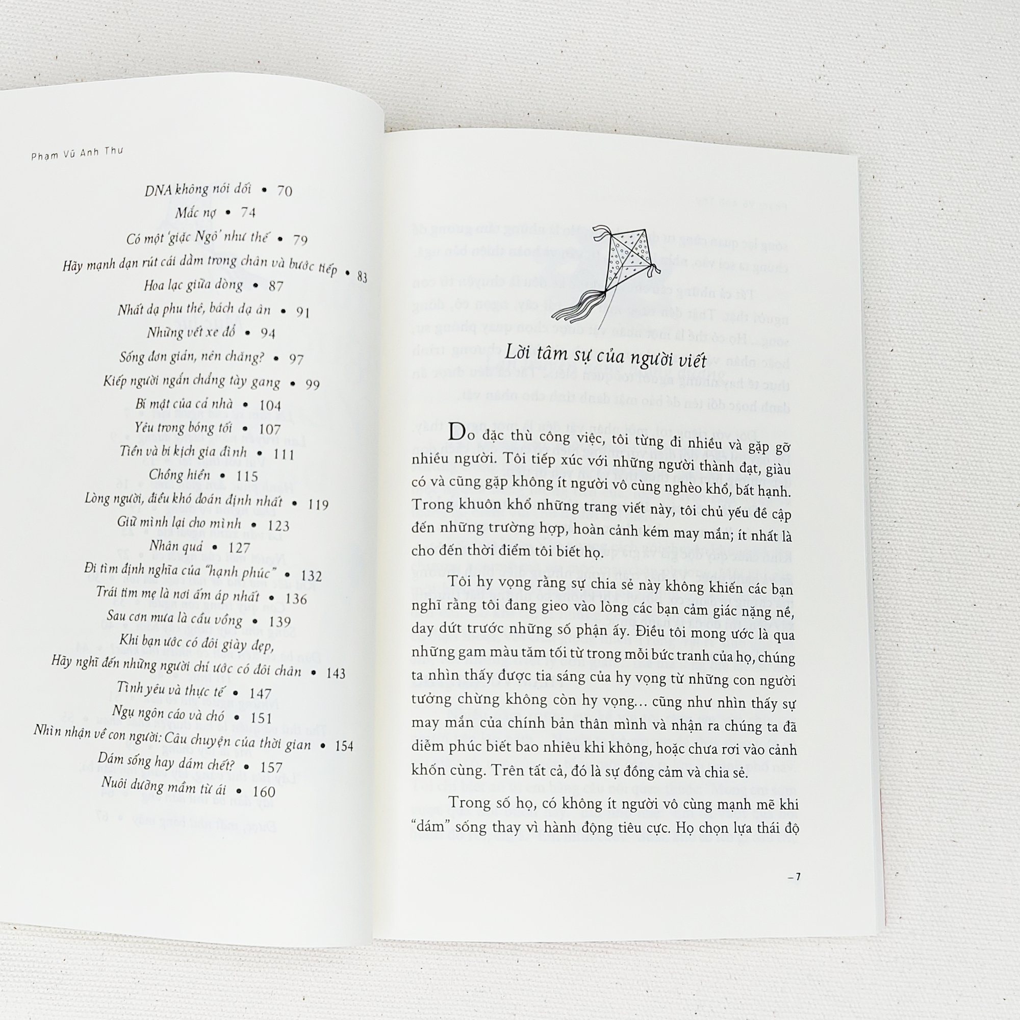 Tất cả những câu chuyện được kể đều là chuyện từ con người thật. Thật đến từng mái nhà, cái cây, ngọn cỏ, dòng sô Họ có thể là một nhân vật được chọn quay phóng sự, hoặc nhân vật trong chương trình từ thiện, chương  trình thực tế hay những người tôi quen biế Tất cả đều được ẩn danh hoặc đổi tên để bảo mật danh tính cho nhân vật. Đối với riêng tôi, mỗi nhân vật đều là một người thầy. Họ dạy tôi cách đối diện với những biến cố cuộc đời, cách dọn dẹp những hỗn độn thừa thãi và an yên đi tiếp.