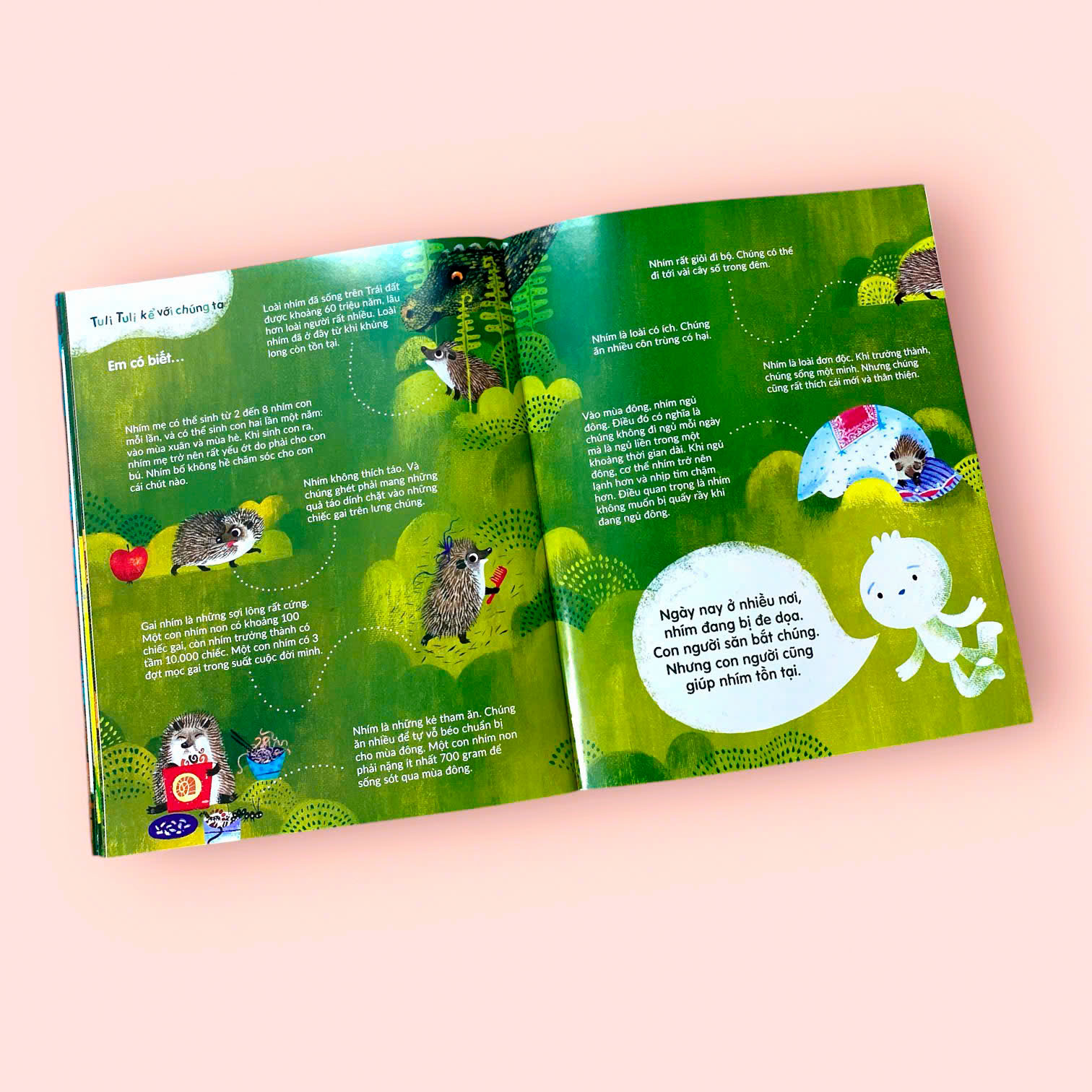 NHÀ NHÍM NƠI CÔNG VIÊN Ở cuốn sách này, sẽ đưa các bạn khám phá môi trường sống của gia đình nhím trong công viên - nơi ẩn chứa nhiều điều thú vị và bất ngờ. Các bạn sẽ được biết đến những thử thách mà hai anh em nhím Patter và Teeny phải đối mặt để sinh tồn trong thế giới đầy rẫy nguy hiểm. Chúng ta sẽ cùng tìm hiểu cách mẹ nhím chăm sóc con non, cách Teeny học hỏi những kỹ năng cần thiết để tự lập và chuẩn bị cho mùa đông khắc nghiệt. Với những bức tranh minh họa sinh động và đẹp mắt, cuốn sách không chỉ khơi gợi trí tưởng tượng và sự tò mò của các bạn nhỏ mà còn mang đến những kiến thức bổ ích về thói quen và lối sống của loài nhím. Qua đó, các bạn sẽ hiểu hơn về thế giới tự nhiên và thêm trân trọng sự đa dạng sinh học của Trái Đất.