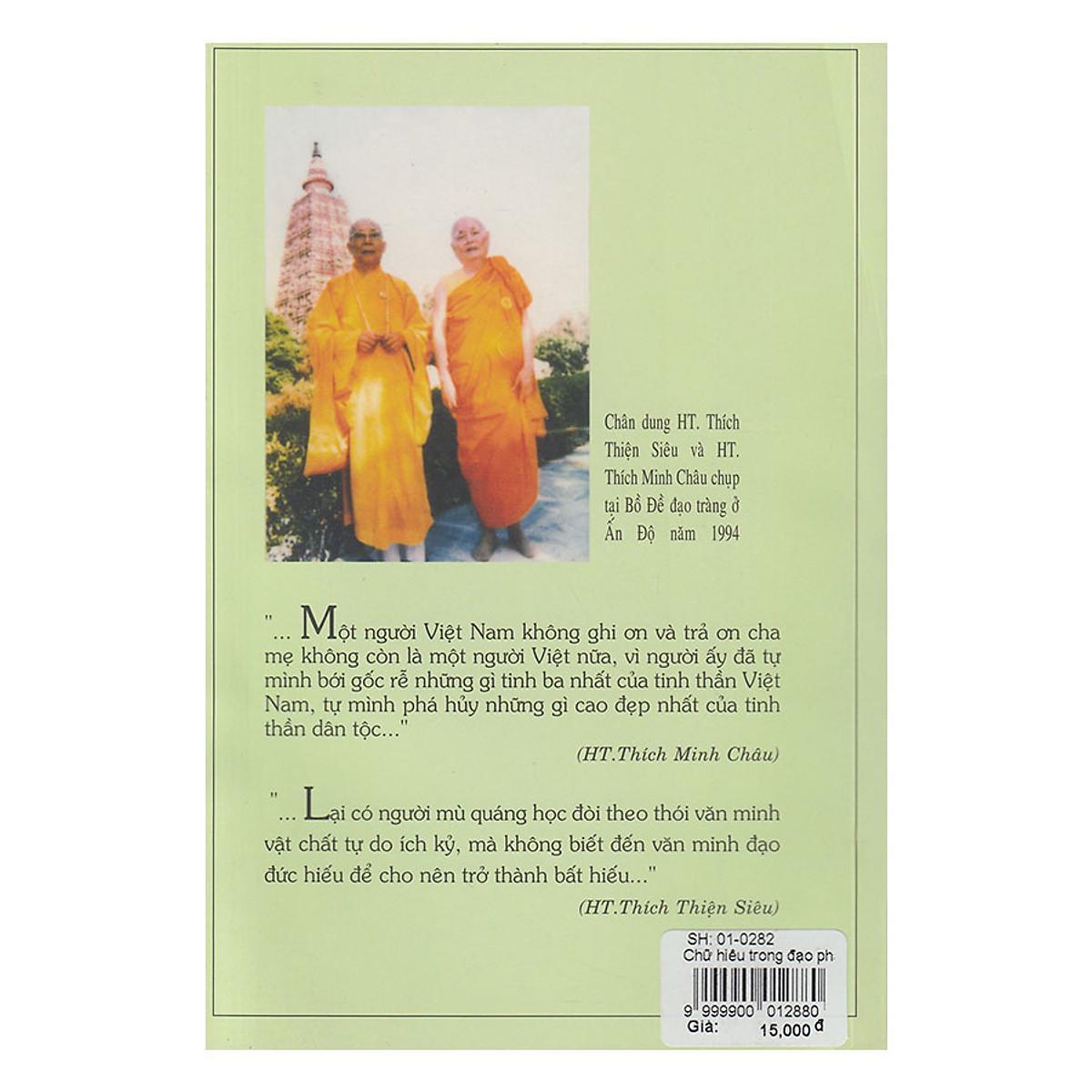 Quyển "Chữ Hiếu trong đạo Phật" này gồm những bài nghiên cứu và thuyết giảng về chữ Hiếu của hai vị Cố Đại lão Hòa thượng Thích Thiện Siêu và Thích Minh Châu mà chúng tôi sưu tập: Ý nghĩa lễ Vu-lan, Những lời dạy của Đức Phật về chữ Hiếu trong kinh tạng Pali, những lời dạy của Đức Phật về chữ Hiếu theo Hán tạng, và Người Việt Nam thương mẹ kính cha qua ca dao tục ngữ Việt Nam của Hòa thượng Thích Minh Châu, Nhớ Vu-lan, Rằm tháng Bảy, Người xuất gia và Hiếu hạnh, Cha lành con thảo cùng một số lời tưởng niệm của Hòa thượng Thích Thiện Siêu.