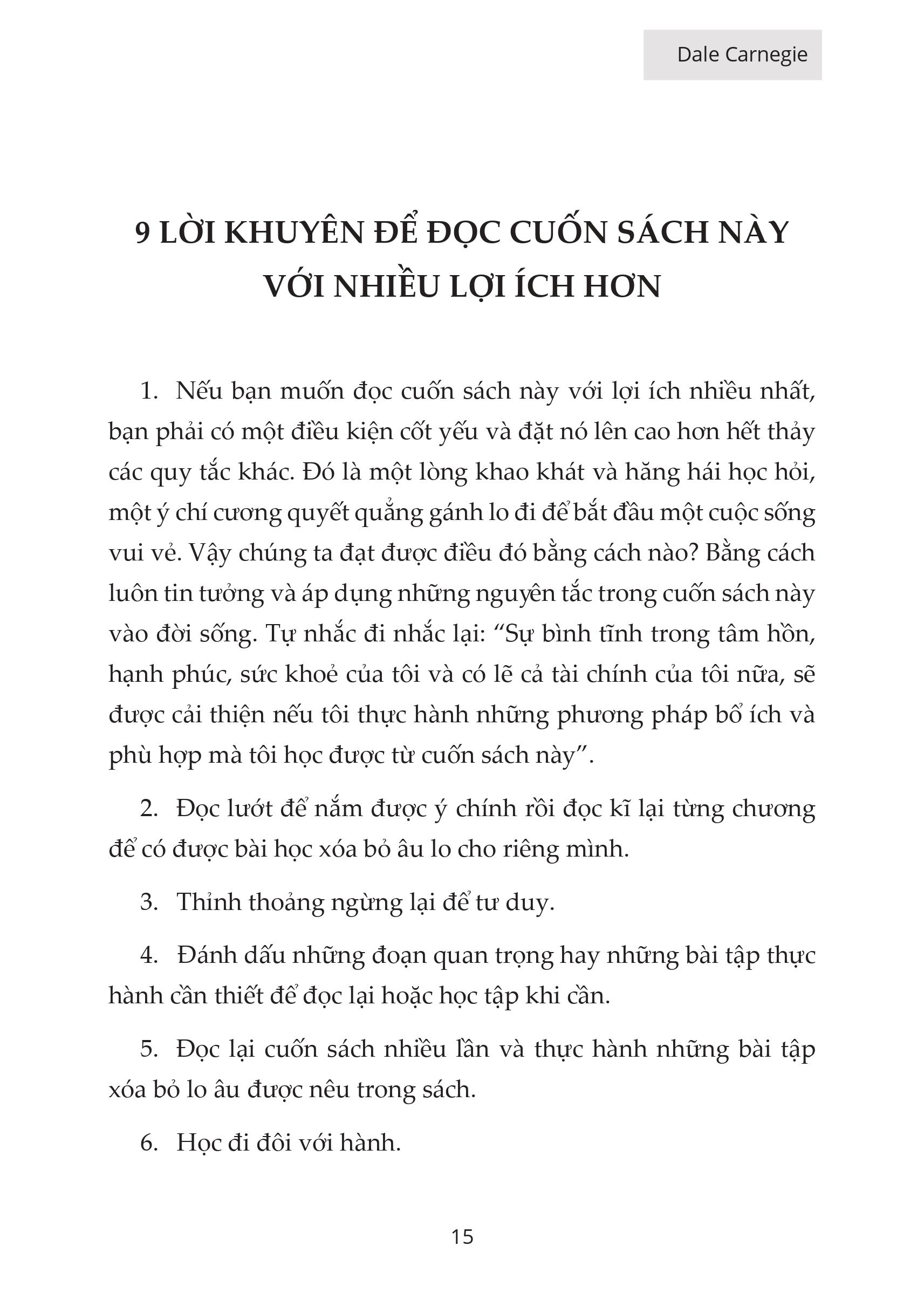 - QUẲNG GÁNH LO ĐI & VUI SỐNG Cuốn sách bao gồm 10 phần khác nhau, với rất nhiều những kinh nghiệm và các lời khuyên từ tác giả cũng như những người đi trước, giúp bạn có thể nhận thức được những điều đúng đắn nhất. Chi tiết Phần 1. Những sự thật bạn cần biết về lo âu Phần 2. Những kĩ thuật cơ bản để phân tích tình trạng lo âu Phần 3. Cách để giũ ỏ âu lo trước khi nó phá huỷ con người Phần 4. 7 cách vun đắp mảnh đất tinh thần để bạn trở nên vui vẻ và hạnh phúc hơn mỗi ngày Phần 5. Nguyên tắc vàng để xoá bỏ lo âu Phần 6. Cách chống lại lo âu khi bị chỉ trích Phần 7. Mệt mỏi dần tan biến - Tinh thần lên đỉnh cao Phần 8. Tìm việc đúng ý gặt hái thành công Phần 9. Cách giảm bớt nỗ lo tài chính Phần 10. Cách để chiến đấu với lo lắng MỘT SỐ HÌNH ẢNH NỘI DUNG THAM KHẢO CAM KẾT