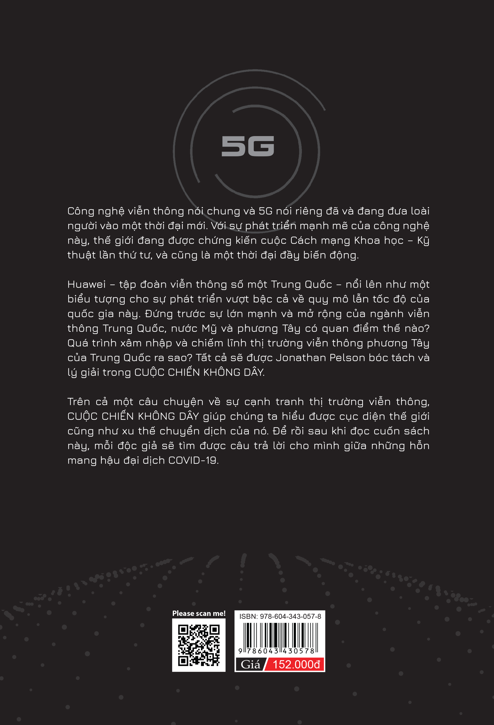 - TÓM TẮT NỘI DUNG Đầu thế kỷ XXI, thế giới đang chứng kiến sự trỗi dậy mạnh mẽ của một “thế lực” tới từ phương Đông. Đó chính là Trung Quốc. Trung Quốc với sự phát triển vượt bậc, thần tốc của mình trong lĩnh vực viễn thông, đang trở thành một trong những đối thủ cạnh tranh. Thậm chí trở thành cái “gai trong mắt” của các ông lớn đến từ phương Tây. Và họ sẽ phải xử sự với vấn đề đó như thế nào, khi sự thâm nhập và đang dần dần chiếm lĩnh thị phần viễn thông ở các nước phương Tây. Hơn thế là sức ảnh hưởng sâu rộng trong các lĩnh vực đời sống –xã hội. Dưới góc nhìn độc đáo, thú vị của mình, tác giả Jonathan Pelson đã lý giải tất cả trong cuốn sách “Cuộc chiến không dây – Thế giới trước sự thống trị của Trung Quốc với mạng di động 5G.” Không chỉ giúp chúng ta hiểu hơn về sự phát triển của công nghệ 5G, về cuộc chiến không dây âm thầm giữa Trung Quốc và các nước phương Tây; mà còn giúp chúng ta có một cái nhìn từ tổng quát tới sâu sắc về những gì đang diễn ra và biến đổi thế giới đa phương, phức tạp này, nhất là trong viễn cảnh đại dịch Covid – 19 đã để lại những hệ quả khôn lường.