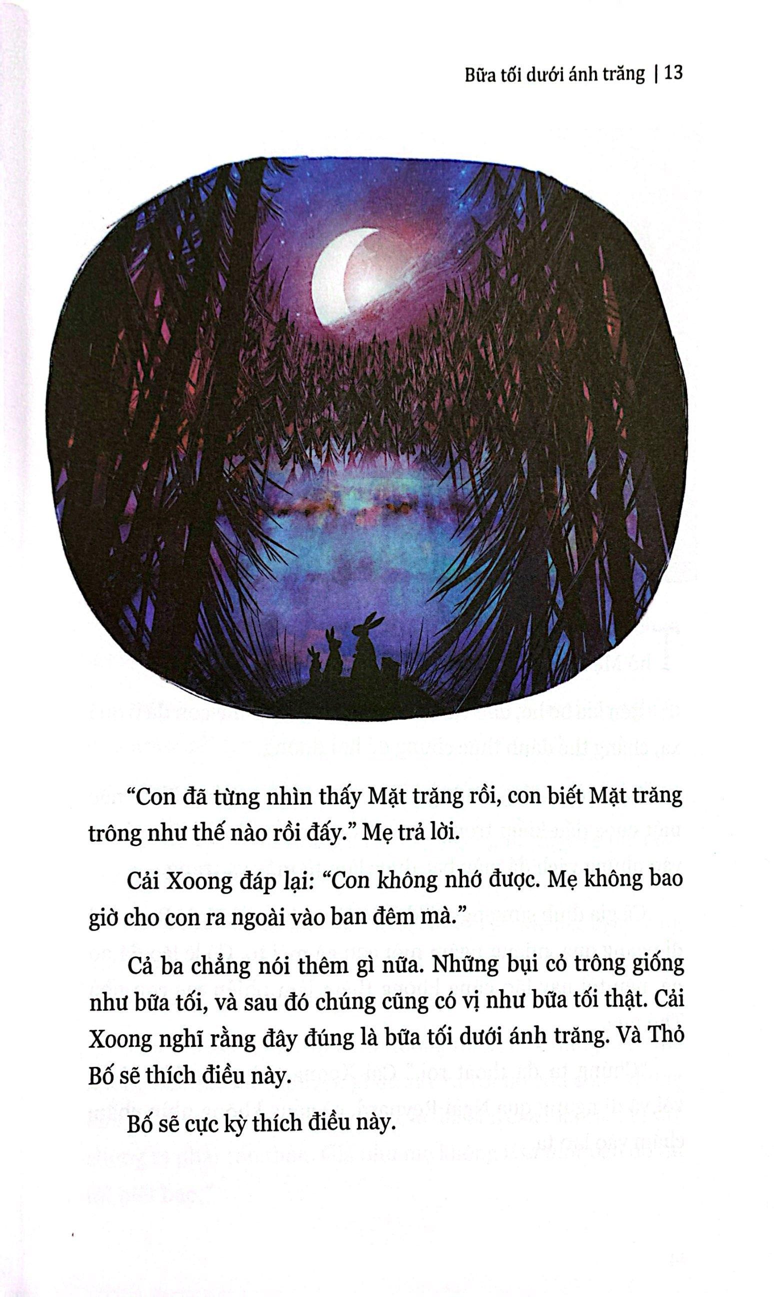 • Nhận xét về cuốn sách của tờ New York Times Minh họa của David Litchfield có màu sắc tươi sáng, rực rỡ đến nỗi ngay cả những cảnh đêm cũng có vẻ như được tắm trong ánh sáng. Tác giả: Gregory Maguire là tác giả của những cuốn sách cực kỳ nổi tiếng trong loạt Wicked Years, bao gồm Wicked: The Life and Time of the Wicked Witch of the West (tạm dịch: Wicked: Cuộc đời và thời đại của phù thủy độc ác miền Tây), tác phẩm đã được chuyển thể thành phim. Ông cũng là tác giả của nhiều cuốn sách dành cho trẻ em, bao gồm What-the-Dickens (tạm dịch: What-the-Dickens: Câu chuyện về một cô Tiên Răng tinh quái), cuốn sách bán chạy nhất của New York Time, và Egg & Spoon (tạm dịch: Trứng và thìa), cuốn sách thiếu nhi đáng chú ý của năm do New York Times Books Review bình chọn. David Litchfield bắt đầu vẽ từ khi còn rất nhỏ, ngoài ra ông còn sáng tác truyện tranh cho anh trai và chị gái của m.ình. Kể từ đó, các tác phẩm của ông đã xuất hiện trên các tạp chí, báo, sách và trên áo phông. Cuốn sách tranh đầu tiên của ông, The Bear and the Piano (tạm dịch: Chú Gấu và cây đàn Piano), đã giành được Giải thưởng Sách thiếu nhi Waterstones. Ông cũng là họa sĩ minh họa cho Rain Before Rainbows (tạm dịch: Mưa trước cầu vồng) của Smriti Prasadam-Halls và War Is Over (tạm dịch: Chiến tranh đã kết thúc) của David Almond. Trích dẫn hay: Cải Xoong gục đầu xuống bàn và nhìn mẹ. Thỏ Mẹ dường như đang bơi trong vũng nước mắt của con gái. Rồi cô dang tay ra, Cải Xoong rời khỏi ghế và trèo vào lòng mẹ. Khi có thể cất nên lời, Cải Xoong nói, “Mặt trăng đã biến mất rồi mẹ ơi.” “Suỵt. Con sẽ đánh thức Kip. Ý con là gì?” Cải Xoong nói với mẹ rằng Mặt trăng, vốn thay đổi hình dạng hằng đêm, cuối cùng đã tan chảy. Nó đã biến mất, cũng như bố vậy. Thỏ Mẹ trả lời: “À, mẹ hiểu rồi. Nhưng Cải Xoong yêu dấu của mẹ, Mặt trăng sẽ mọc lại thôi. Nó đến và đi. Cũng giống như nỗi buồn. Ý mẹ là nỗi buồn cũng đến và đi như vậy. Lúc mạnh lúc yếu – là những từ để chỉ cách Mặt trăng lớn lên, dần biến thành hình tròn rồi lại nhỏ đi, tan biến. Cứ thế lặp đi lặp lại. Nó luôn quay trở lại. Đó là một phần bình thường của cuộc sống. Con sẽ quen với việc này. Con sẽ học được rằng con có thể sống qua những đêm không trăng.” Cải Xoong khóc to hơn. “Mẹ biết,” Thỏ mẹ nói, lắc lư và vuốt ve. Các bà mẹ biết tất cả mọi thứ. “Mẹ biết. Mặt trăng sẽ biến mất và quay trở lại, nhưng bố con thì không. Mẹ biết. Và những ký ức của con về bố con dường như sẽ phai nhạt dần. Nhưng rồi chúng sẽ quay lại. Mẹ hứa. Tình yêu của con dành cho bố đôi khi sẽ bị lu mờ bởi những thứ khác. Giống như sự sợ hãi. Và, ừ, bởi những niềm vui khác. Thật vậy. Nhưng rồi tình yêu của con dành cho bố con vẫn sẽ quay trở lại. Bố con sẽ không quay lại đâu, Thỏ Bố thân yêu của chúng ta. Nhưng bố con không rời bỏ chúng ta mãi mãi chừng nào chúng ta còn yêu mến và nhớ đến anh ấy.”