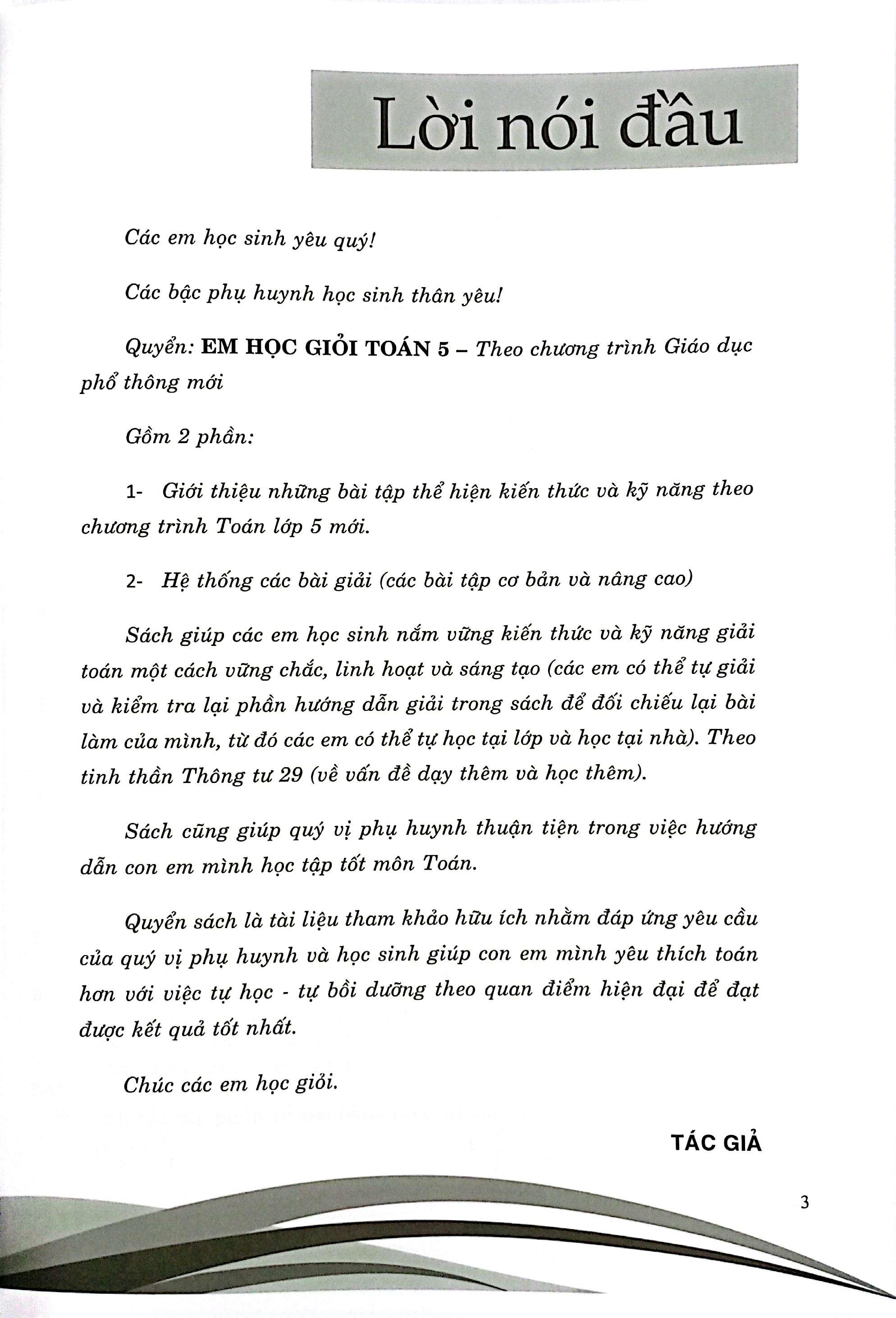 Em Học Giỏi Toán 5 (Dùng Chung Các Bộ SGK) Để giúp các thầy cô giáo, các bậc phụ huynh và các em học sinh có tài liệu tham khảo để dạy và học tốt môn Toán, chúng tôi biên soạn cuốn sách Giúp em giỏi Toán lớp 5. Cuốn sách được viết theo từng chủ đề, bám sát Chương trình Giáo dục phổ thông mới (Chương trình 2018). Mỗi chủ đề gồm 2 phần chính: Phần 1: Kiến thức cần nhớ Phần 2: Các bài tập Phần 1 là hệ thống các kiến thức cơ bản, cần thiết được đúc rút ra từ bài học. Nắm vững những kiến thức đó, các em sẽ vận dụng linh hoạt để làm tốt các bài tập. Phần 2 là các bài tập chọn lọc, tiêu biểu được sắp xếp có hệ thống theo mạch kiến thức gồm bài tập cơ bản và bài tập nâng cao. Làm tốt các bài tập cơ bản, các em tiếp tục thử sức với các bài tập nâng cao để phát triển tư duy toán học, giúp các em say mê và yêu thích môn Toán. Hi vọng, cuốn sách sẽ là tài liệu bổ ích, thiết thực giúp các em học giỏi môn Toán như chính tên gọi của cuốn sách.