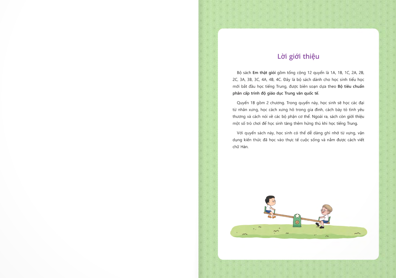 Em Thật Giỏi - 1B Em thật giỏi là bộ sách dành cho học sinh tiểu học mới bắt đầu học tiếng Trung, được biên soạn dựa theo Bộ tiêu chuẩn phân cấp trình độ giáo dục Trung văn quốc tế và bài thi YCT (Youth Chinese Test – bài thi tiếng Trung dành cho học sinh). Bộ sách gồm 12 quyển là 1A, 1B, 1C, 2A, 2B, 2C, 3A, 3B, 3C, 4A, 4B, 4C. Mỗi quyển có 2-3 chương. Mỗi chương bao gồm các phần: Học từ vựng, Nói, Luyện tập, Chơi trò chơi, Học chữ Hán, Mẩu chuyện, Nhìn ra thế giới, Thực hành, Kiểm tra. Với bộ sách này, học sinh có thể dễ dàng ghi nhớ từ vựng, nắm được cách viết chữ Hán, biết vận dụng kiến thức đã học khi giao tiếp trong thực tế và mở mang tầm nhìn về thế giới xung quanh.