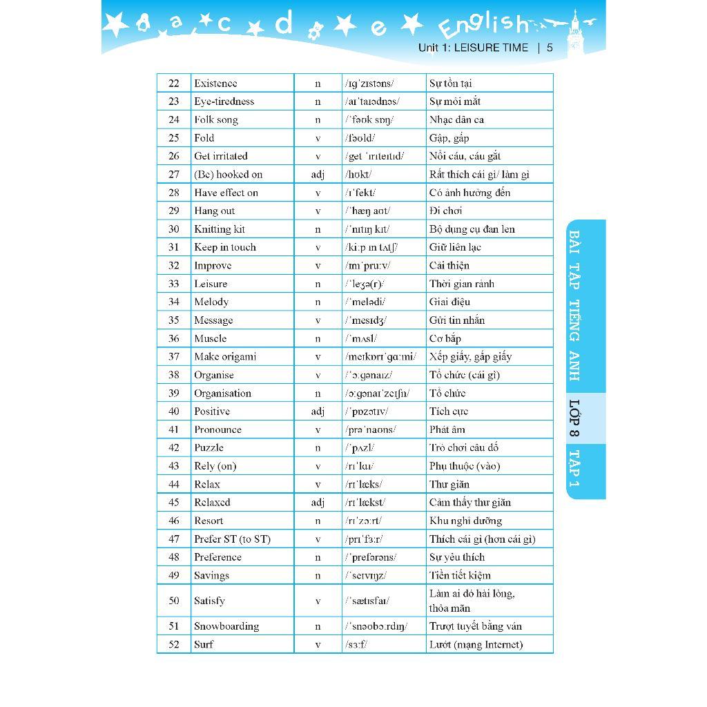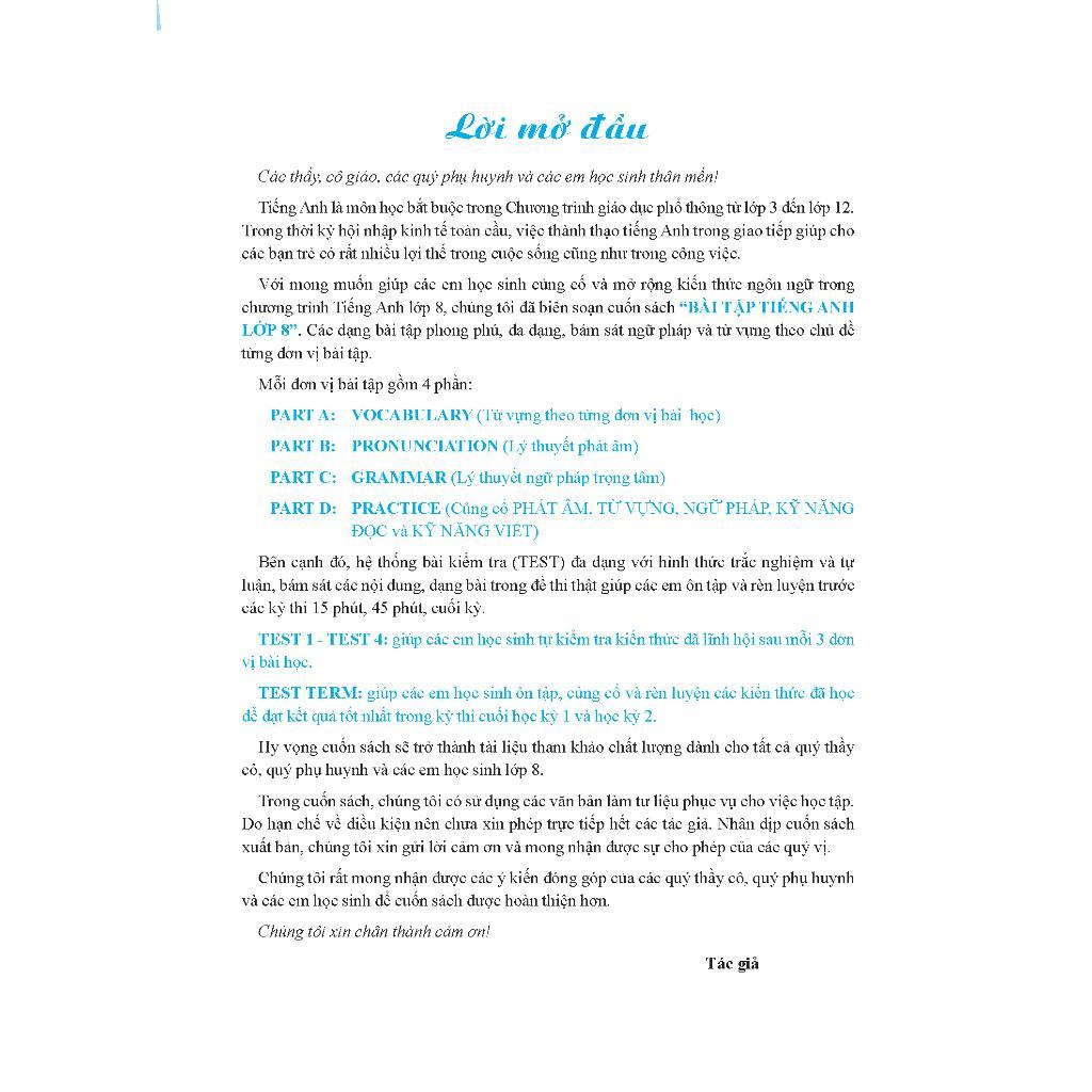 Chương trình Tiếng Anh lớp 8, chúng tôi đã biên soạn cuốn sách “BÀI TẬP TIẾNG ANH LỚP 8". Các dạng bài tập phong phú, đa dạng, bám sát ngữ pháp và từ vựng theo chủ đề từng đơn vị bài tập. Mỗi đơn vị bài tập gồm 4 phần: