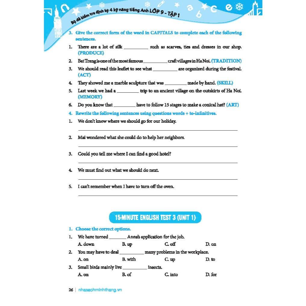 “Bộ đề kiểm tra định kỳ 4 kỹ năng nghe - nói - đọc - viết Tiếng Anh lớp 9” nhằm rèn luyện cho các em kĩ năng làm bài thi, làm chủ các dạng đề, hiểu được kết cấu và cách thức ra đề của từng kỳ thi. Khi các em đã quen với các dạng bài tập và trải