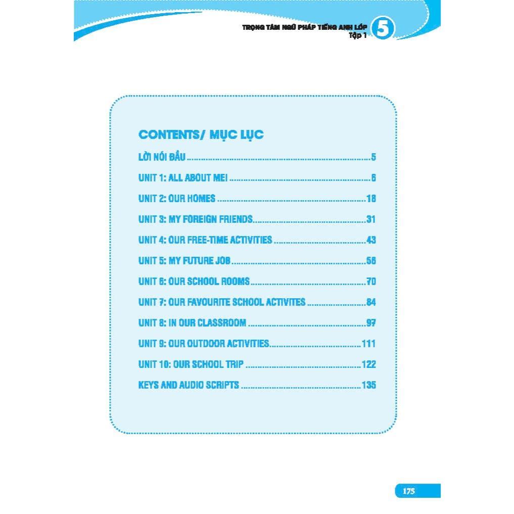 Nhằm mục đích giúp giáo viên và các em học sinh có thêm tài liệu luyện tập, củng cố, mở rộng và nâng cao kiến thức, chúng tôi biên soạn bộ sách Trọng tâm ngữ pháp Tiếng Anh lớp 5. Bộ sách gồm hai tập: