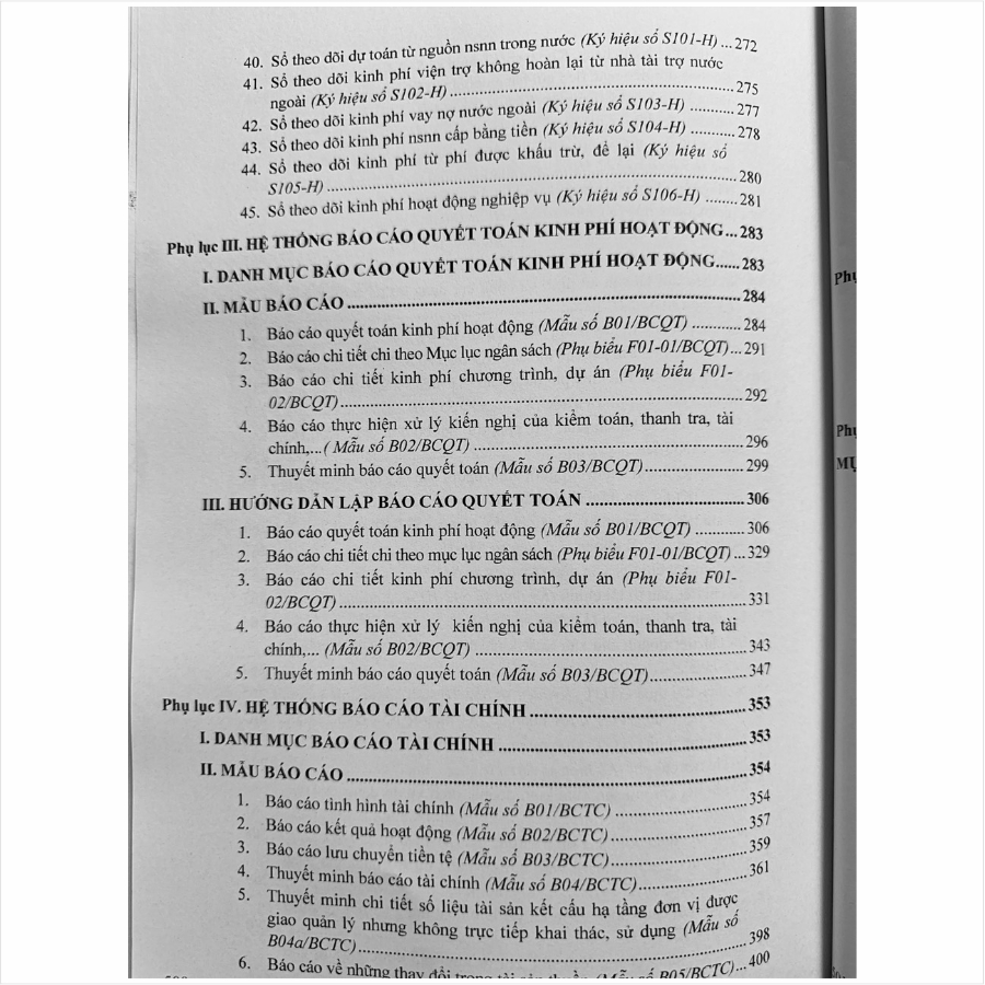 - Toàn bộ sách bìa mềm khổ lớn 19 x 27 cm phân phối bởi Nhà sách Nam Việt đều được bọc sách Plastic MIỄN PHÍ và xuất hóa đơn điện tử đầy đủ, nhanh chóng. …/… Lời giới thiệu: Ngày 17 tháng 4 năm 2024, Bộ Tài chính ban hành Thông tư số 24/2024/TT-BTC hướng dẫn Chế độ kế toán hành chính, sự nghiệp gồm: chứng từ kế toán, tài khoản kế toán, sổ kế toán, báo cáo quyết toán kinh phí hoạt động, báo cáo tài chính; quy trình in, sắp xếp, đóng để lưu trữ tài liệu kế toán của các đơn vị. Đối tượng được áp dụng cho các đơn vị kế toán, bao gồm: Cơ quan nhà nước (trừ Ủy ban nhân dân xã, phường, thị trấn sử dụng ngân sách cấp xã); Đơn vị sự nghiệp công lập; Tổ chức chính trị; tổ chức chính trị – xã hội; Mặt trận Tổ quốc Việt Nam và tổ chức, cơ quan, đơn vị khác là đơn vị sử dụng ngân sách nhà nước; Tổ chức, cơ quan, đơn vị thực hiện cơ chế tài chính của đơn vị sự nghiệp công lập. Nhằm phổ biến đến Quý Cơ quan, Đơn vị và Quý khách hàng thân thiết nắm bắt kịp thời những quy định mới nêu trên. Nhà sách Nam Việt xin trân trọng giới thiệu cuốn sách: HƯỚNG DẪN HƯỚNG DẪN CHẾ ĐỘ KẾ TOÁN HÀNH CHÍNH, SỰ NGHIỆP theo Thông tư số 24/2024/TT-BTC ngày 17 tháng 4 năm 2024 của Bộ Tài chính .../... Nội dung cuốn sách gồm có các phụ lục sau: Phụ lục I. HỆ THỐNG TÀI KHOẢN KẾ TOÁN VÀ HƯỚNG DẪN HẠCH TOÁN KẾ TOÁN; Phụ lục II. HỆ THỐNG SỔ KẾ TOÁN; Phụ lục III. HỆ THỐNG BÁO CÁO QUYẾT TOÁN KINH PHÍ HOẠT ĐỘNG; Phụ lục IV. HỆ THỐNG BÁO CÁO TÀI CHÍNH Phụ lục V. QUY TRÌNH IN, SẮP XẾP, ĐÓNG ĐỂ LƯU TRỮ TÀI LIỆU KẾ TOÁN; ...//... Cảm ơn các bạn đã ghé thăm shop Nhà sách Nam Việt ! Sách HƯỚNG DẪN HƯỚNG DẪN CHẾ ĐỘ KẾ TOÁN HÀNH CHÍNH, SỰ NGHIỆP theo Thông tư số 24/2024/TT-BTC ngày 17 tháng 4 năm 2024 của Bộ Tài chính Sách HƯỚNG DẪN HƯỚNG DẪN CHẾ ĐỘ KẾ TOÁN HÀNH CHÍNH, SỰ NGHIỆP theo Thông tư số 24/2024/TT-BTC ngày 17 tháng 4 năm 2024 của Bộ Tài chính