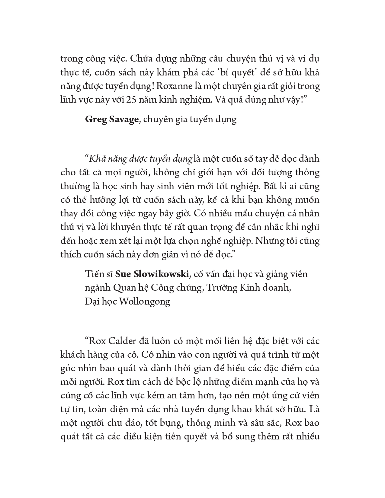Tác giả Roxanne Calder không phải nhà tuyển dụng mà bạn thường thấy. Cách tiếp cận của bà đối với công việc và cuộc sống là đi sâu và trực tiếp đối đầu với từng thử thách bằng cả trái tim. Trong quản lí và tuyển dụng, bà thích nhìn thấy tiềm năng trong con người. Khám phá những phẩm chất tiềm ẩn của con người là kĩ năng của bà.